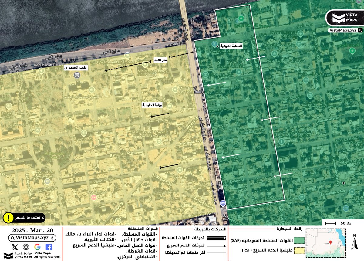 – القوات المسلحة تواصل اجتياح المنطقة المحاصرة في وسط الخرطوم مُحكمة قبضتها على مبانٍ ذات أهمية، ومقلصة المسافة بينها وبين القصر الجمهوري إلى 400 متر.