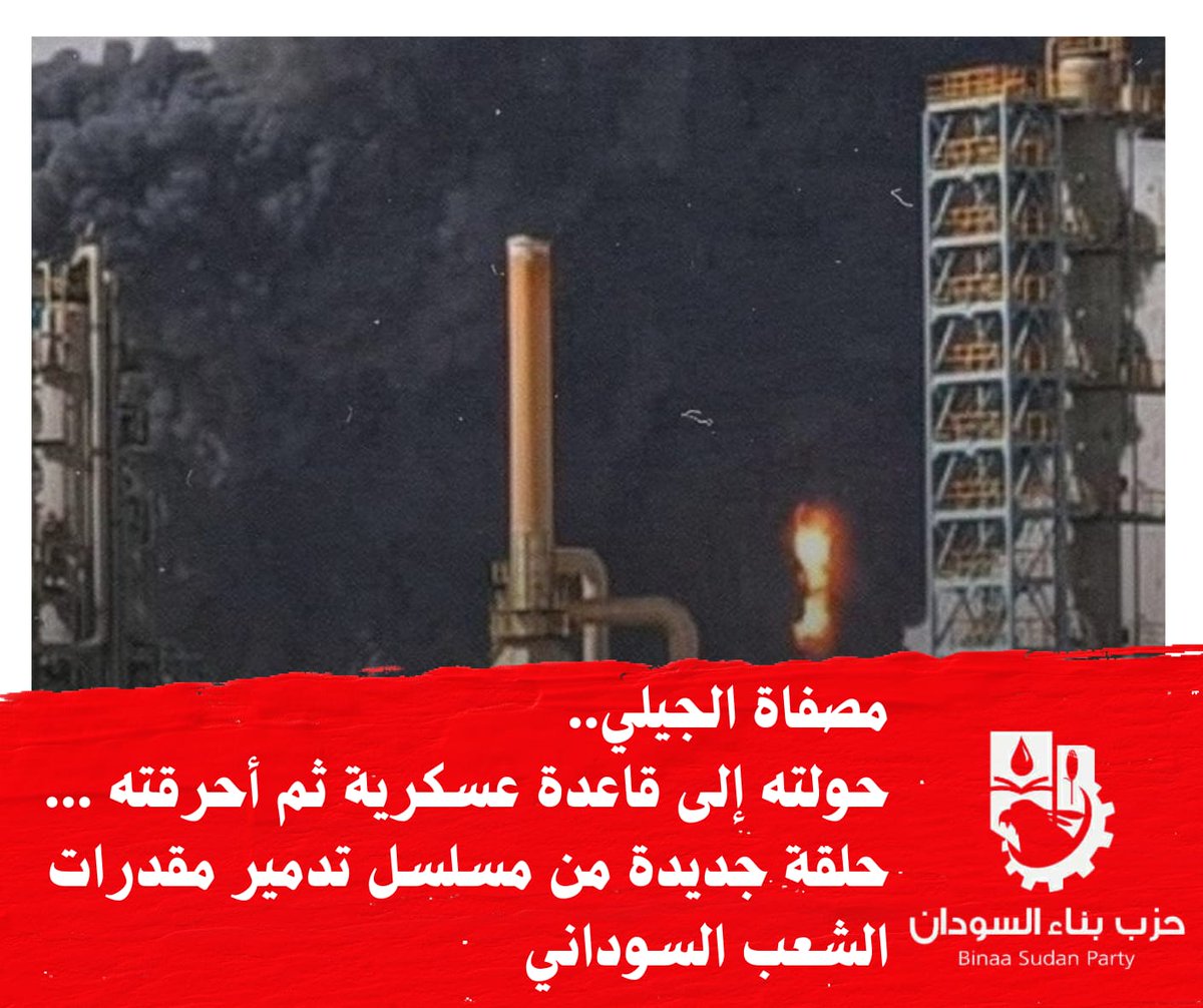 ندين في حكومة ظل حزب بناء السودان إحراق مصفاة الجيلي بأشد العبارات، ونؤكد ضرورة محاسبة المسؤولين عنه مهما طال الزمن.