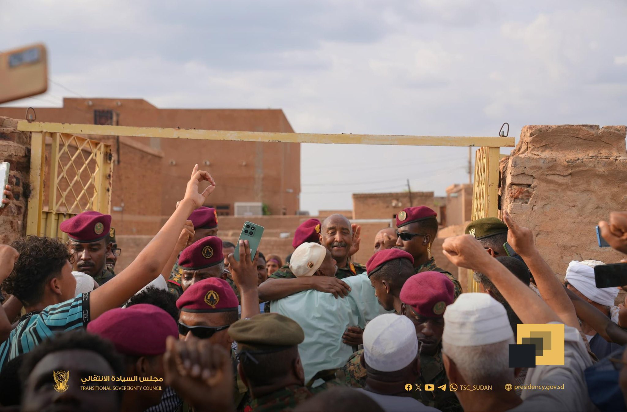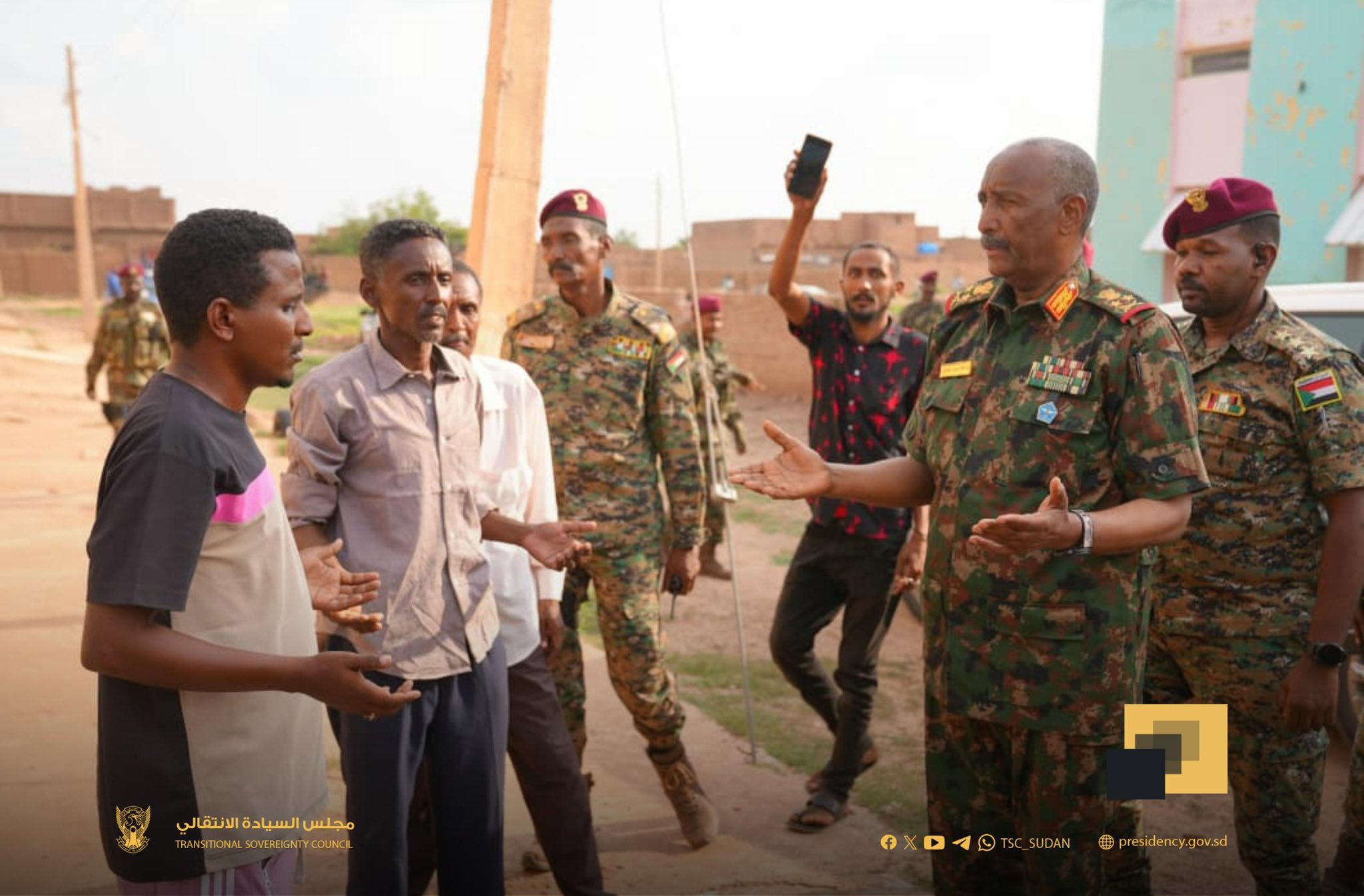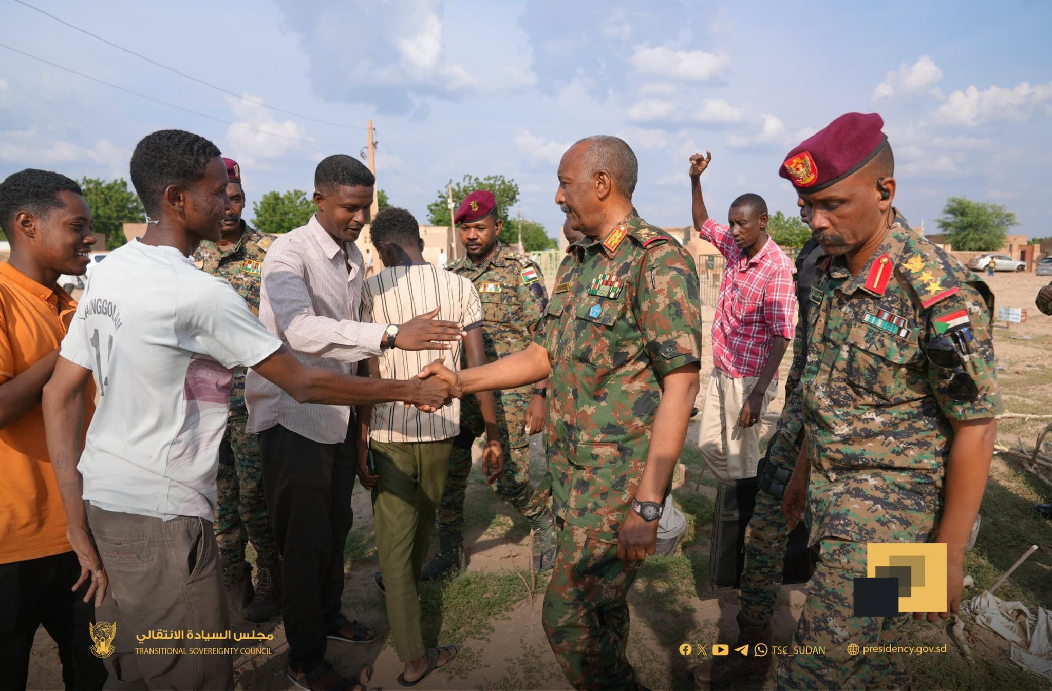 وكانت جموع غفيرة من مواطني المنطقة قد تدافعت لاستقبال رئيس مجلس السيادة، مرددين هتافات (شعب واحد جيش واحد).