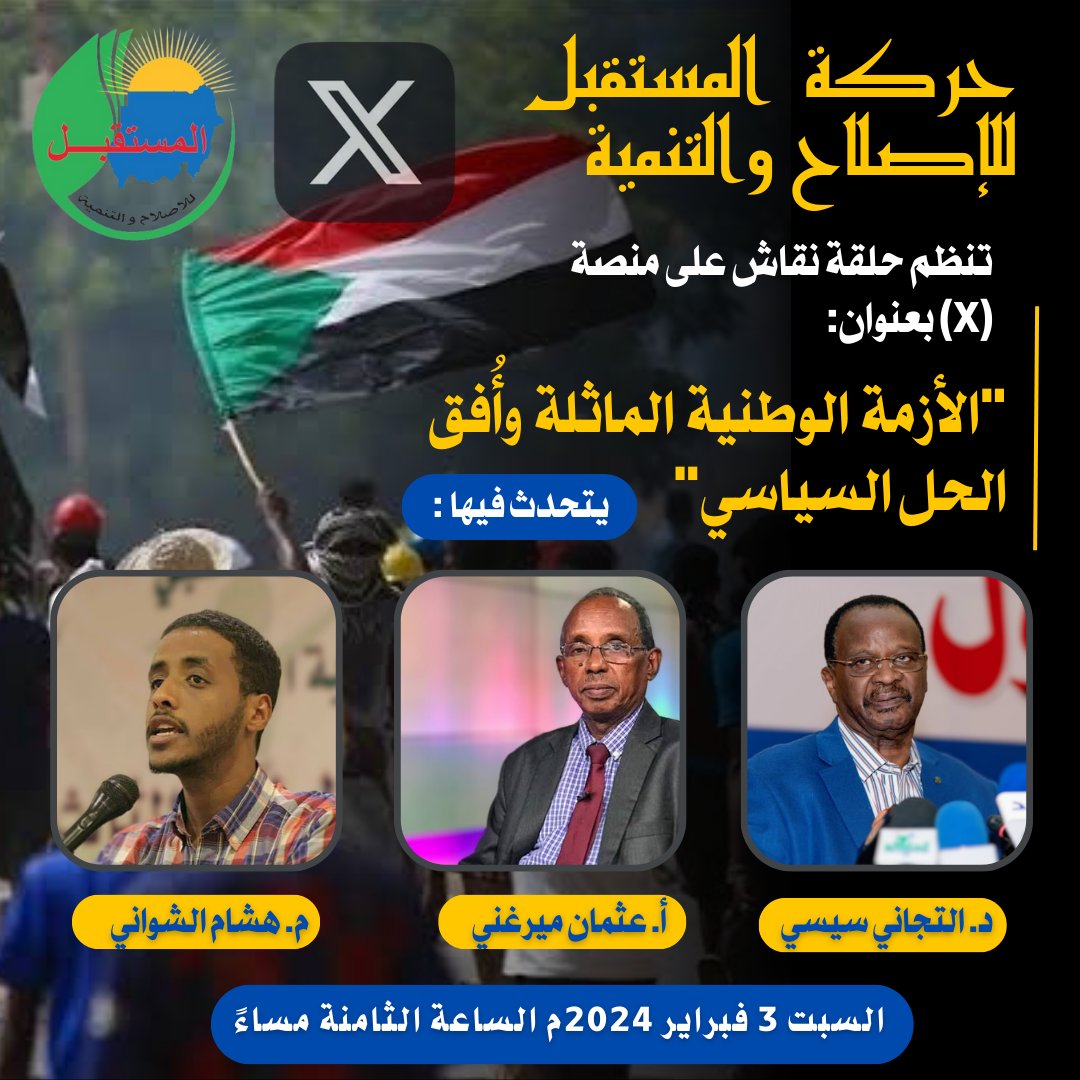 أمانة الإعلام ب”حركة المستقبل للإصلاح والتنمية” تنظم حلقة نقاش على منصة (X) بعنوان : “الأزمة الوطنية الماثلة وأفق الحل السياسي” يتحدث في المساحة: