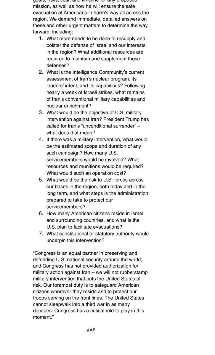 🚨 رسالة ل #ترامب من أعضاء مجلس شيوخ ديمقراطيين يطالبونه فيها بإبلاغهم بتفاصيل احتمال المشاركة الاميركية في حرب #ايران و #اسرائیل ، فيها ٧ اسئلة: