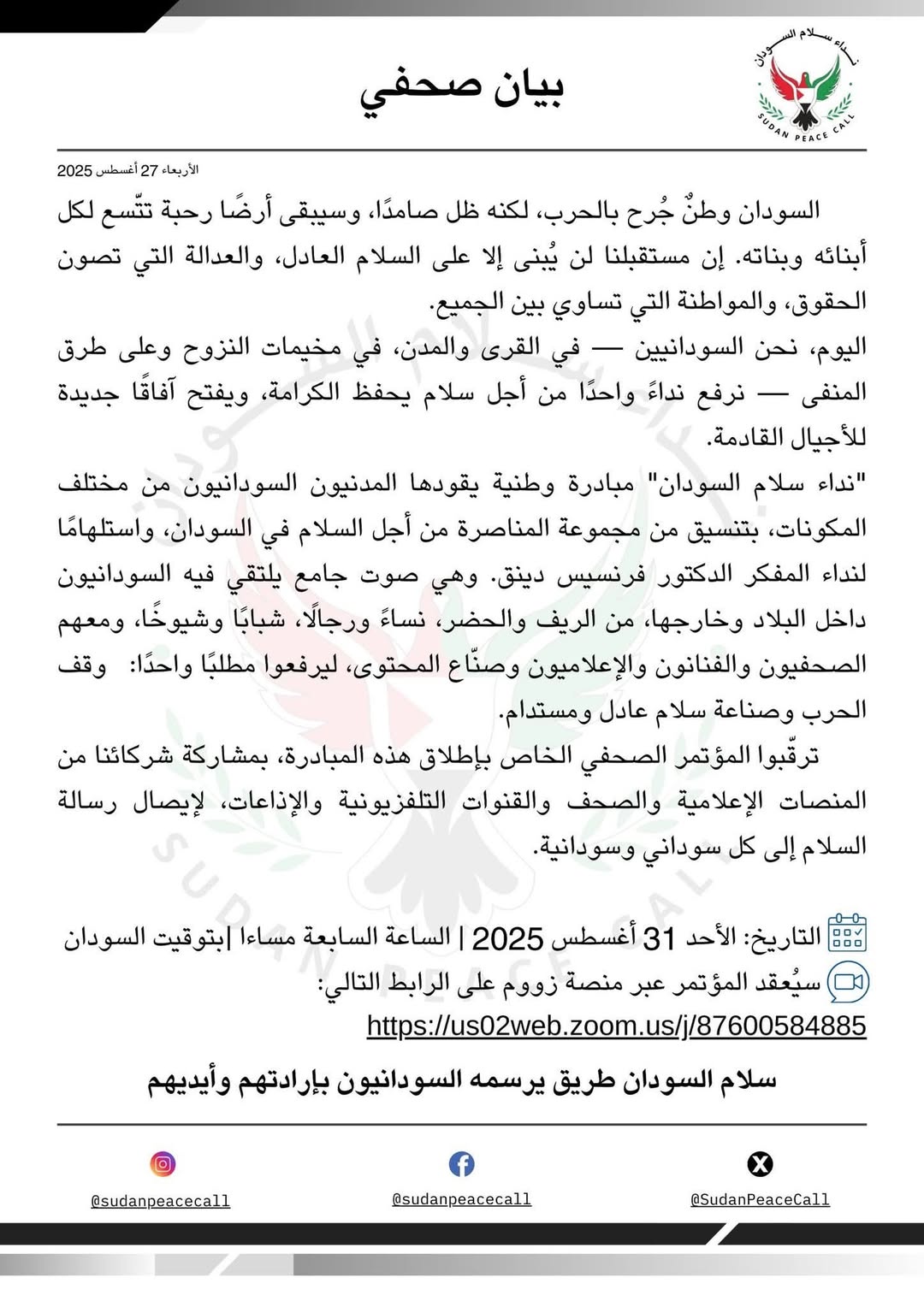 “نداء سلام السودان مبادرة وطنية يقودها المدنيون السودانيون من مختلف المكونات، بتنسيق من مجموعة المناصرة من أجل السلام في السودان، واستلهاما لنداء المفكر الدكتور فرنسيس دينق وهي صوت جامع يلتقي فيه السودانيون داخل البلاد وخارجها، من الريف والحضر، نساءً ورجالا، شبابًا وشيوخا، ومعهم الصحفيون والفنانون والإعلاميون وصناع المحتوى، ليرفعوا مطلبًا واحدًا وقف الحرب وصناعة سلام عادل ومستدام.