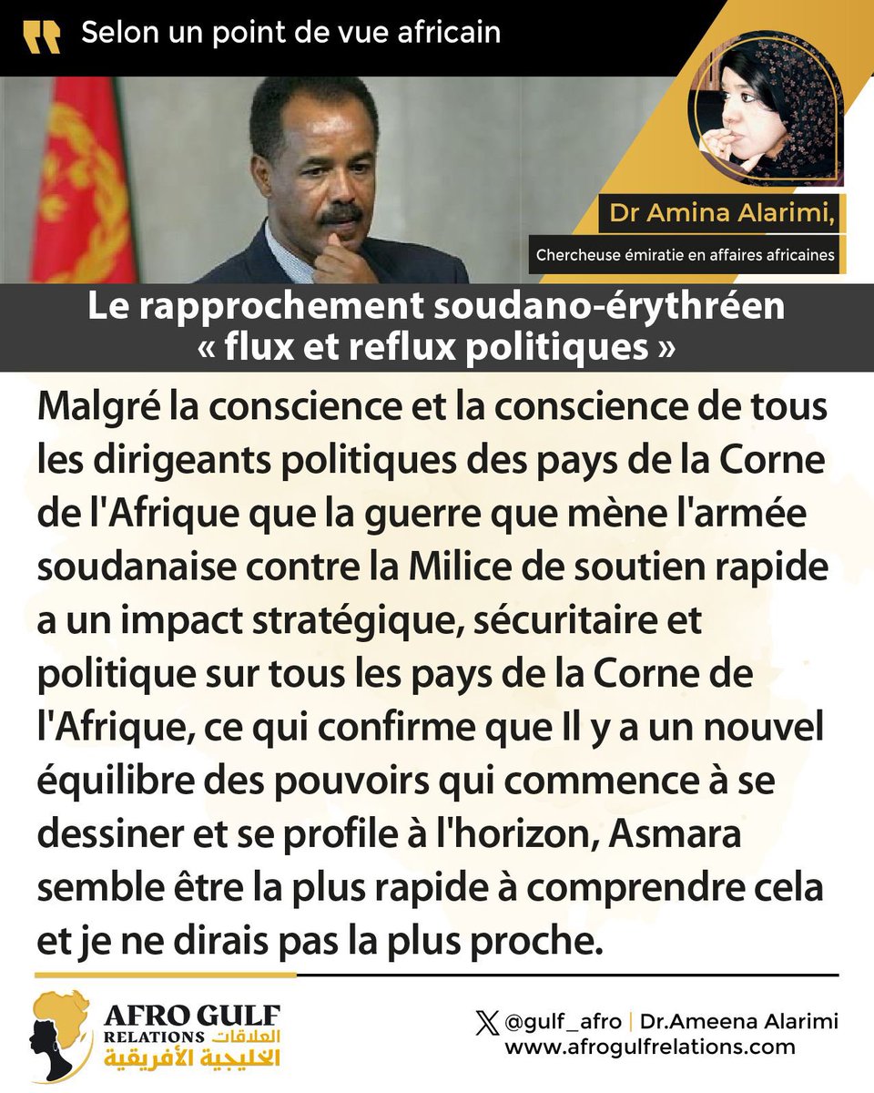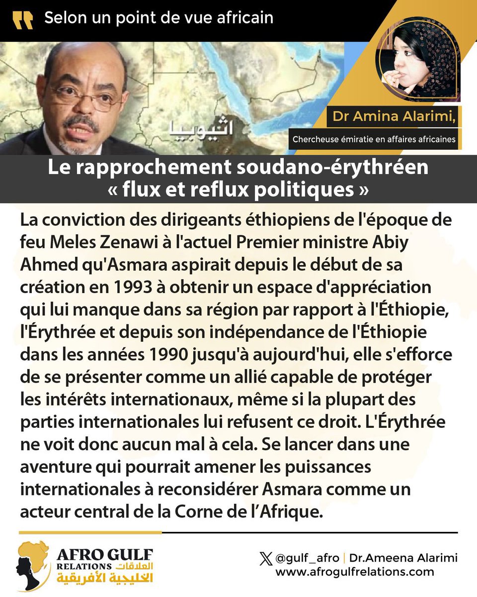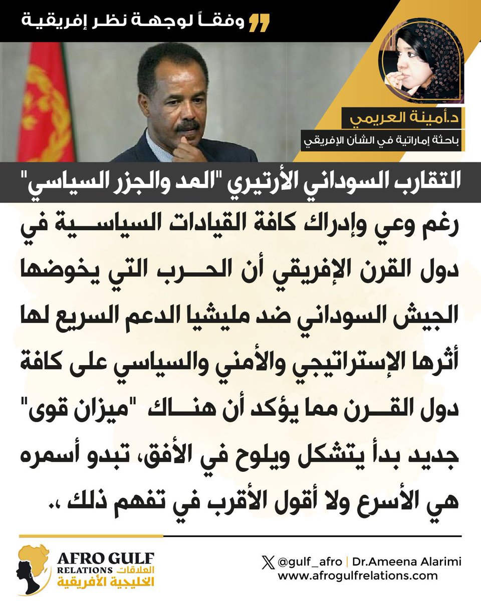 6️⃣ إنخراط الجيش الأرتيري في دعم العمليات العسكرية لصالح #الجيش_السوداني إذا وقع سيعزز من الحضور السياسي والأمني الأرتيري في المجتمعات المحلية المشتركة مع #السودان خاصة بين مجتمع بني عامر والبجا، في إطار مساعي أسمرة الحثيثة لحل أزمة المجتمعات المحلية حول ملكية الأراضي في تلك الولايات الحدودية مع السودان “كسلا، البحر الأحمر، القضارف، النيل الأزرق”، وفي ذات الوقت سيفرض واقعاً جديداً لمستقبل قيادة القرن الإفريقي.