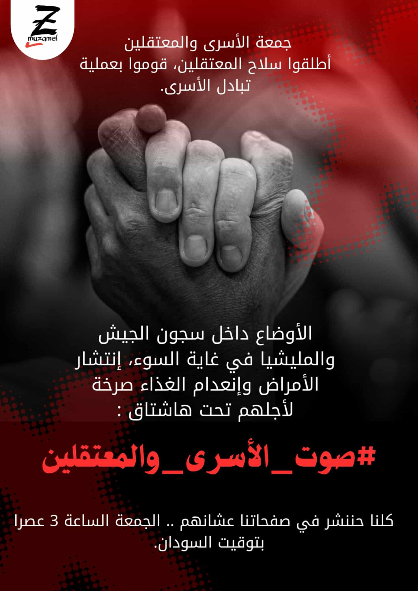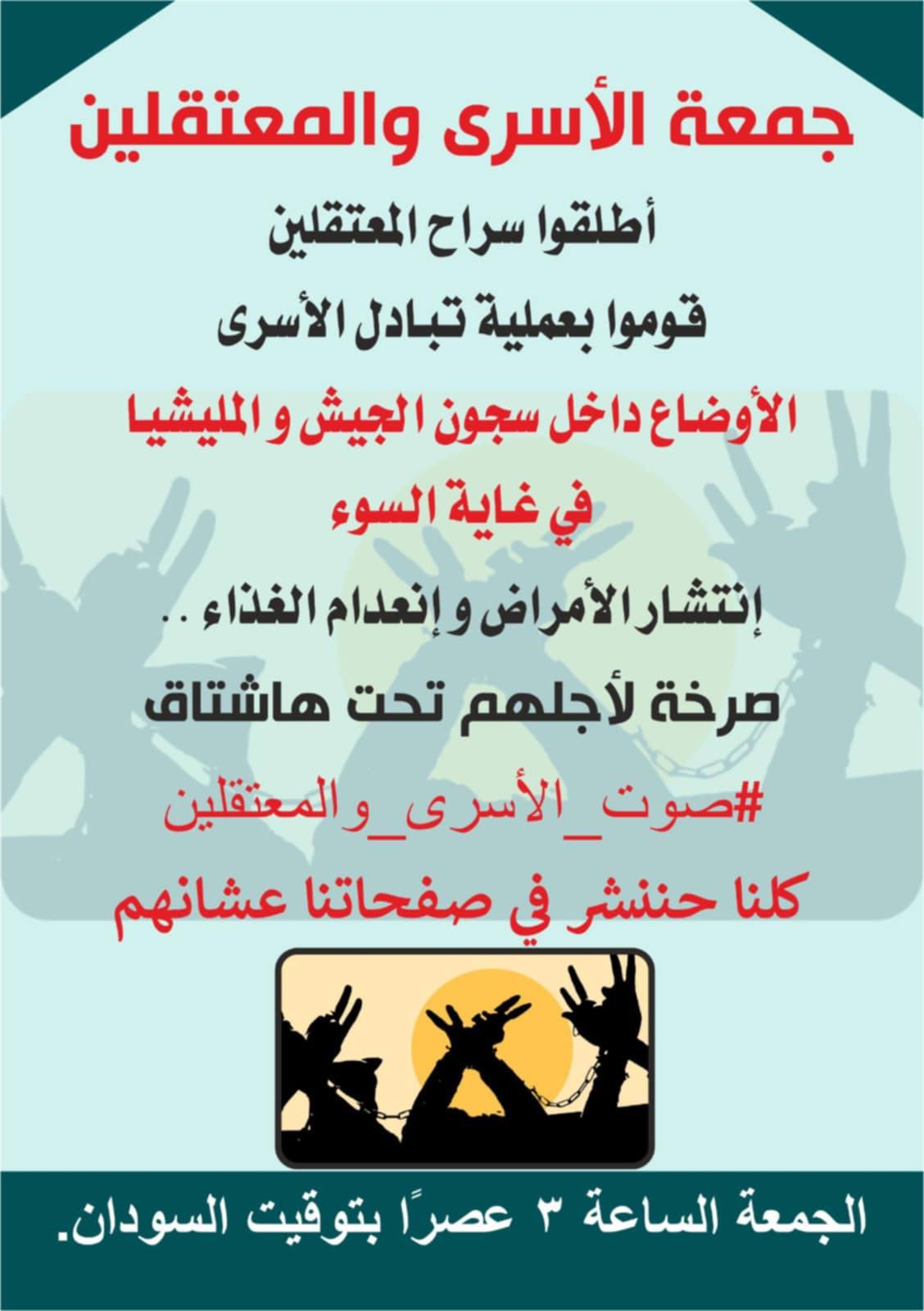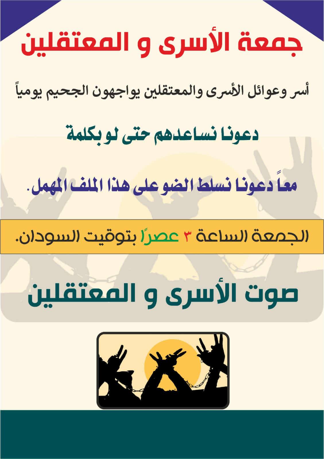 تحياتي جميعاً … خش أخمش من البوسترات دي البعجبك .. وأنشر في صفحتك .. تحشيد ودعوة لجمعة الأسرى والمعتقلين .. بكرة الساعة 3 بتوقيت السودان حنزل بوسترات وبوستات وهاشتاق #صوت_الأسرى_والمعتقلين ارحكم نسلط الضو على الملف المنسي ده وننفض منو الغبار، ساعد الأسر والعوائل حتى لو بكلمة .. عسى ولعل تكون سبب في عودة ابنهم .. يلا أرح، أضغط لايك هنا، اي اي أضغط لايك هنا، مهم شديد، وخش شيل البوستر البعجبك وأنشروا في صفحتك، ارح ارح .. محبة وسلام.
