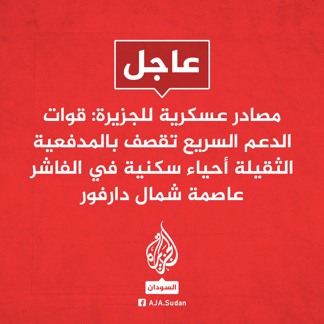عاجل | مصادر عسكرية للجزيرة: قوات الدعم السريع تقصف بالمدفعية الثقيلة أحياء سكنية في #الفاشر عاصمة شمال دارفور