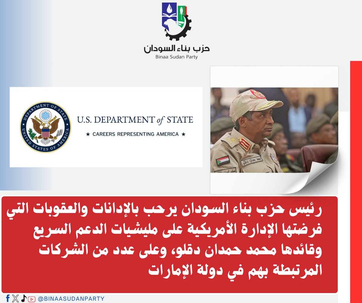 رئيس حزب بناء السودان يرحب بالإدانات و العقوبات التي فرضتها الإدارة الأمريكية على مليشيات الدعم السريع و قائدها محمد حمدان دقلو ، و على عدد من الشركات المرتبطة بهم في دولة الامارات.