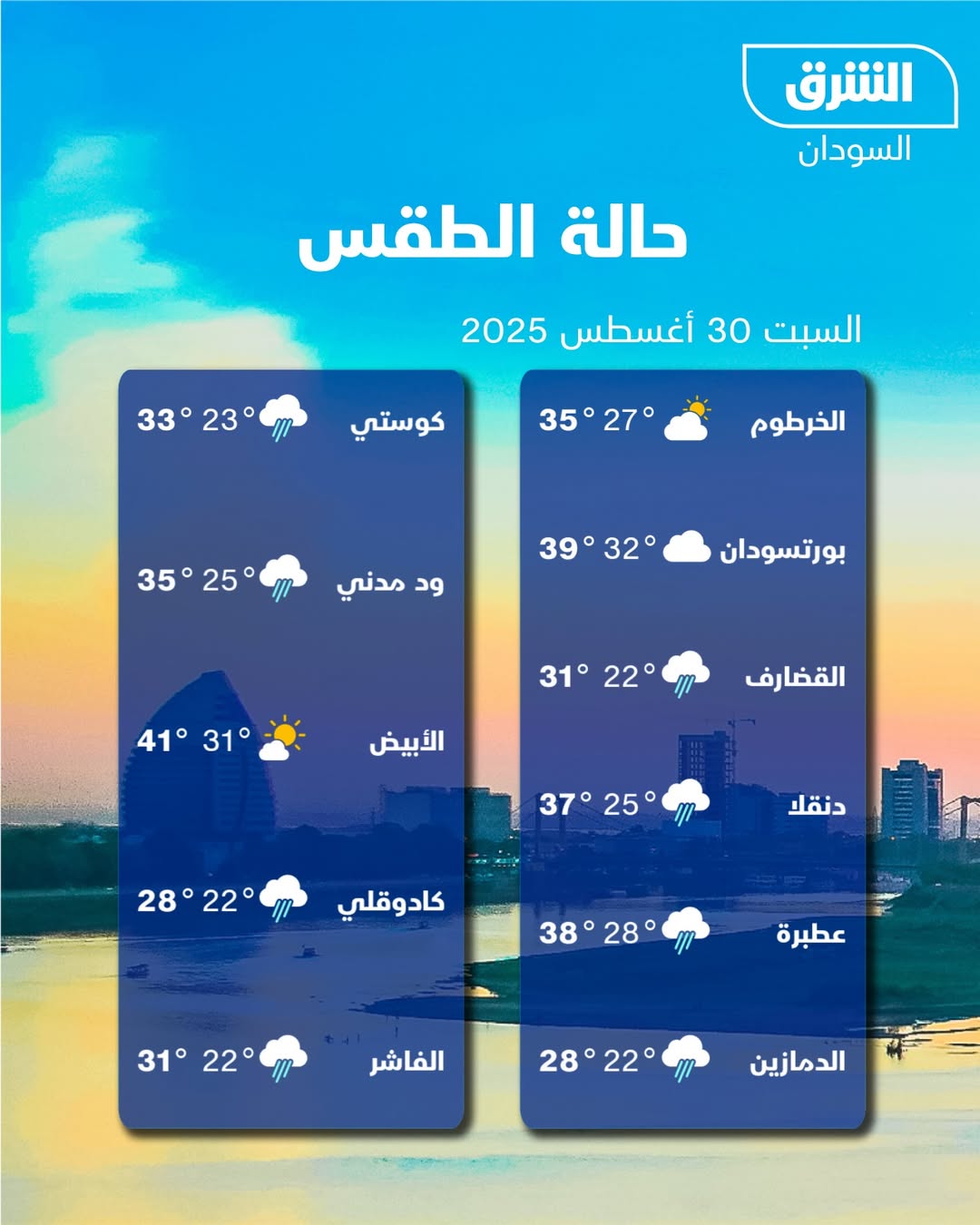 قناة الشرق حالة #الطقس في #السودان غداً #الشرق_السودان By null Published August 30, 2025 Share SHARE Facebook Twitter Pinterest LinkedIn حالة #الطقس في #السودان غداً #الشرق_السودان Source Facebook Twitter Pinterest LinkedIn Share This Article Facebook Twitter Email Print Previous Article طائرات مُسيّرة تحاول استهداف مدينة مروي. #Sudan_War_Updates … Next Article منسقية النازحين في إقليم دارفور تنشر مقطعًا مصورًا يظهر حالة مأساوية في أحد مراك… Leave a Comment Leave a Reply Cancel replyYour email address will not be published. Required fields are marked *Comment * Name * Email * Website Save my name, email, and website in this browser for the next time I comment. Δ SearchSearchRecent Postsانهيار جسر للمشاة في شارع جامعة الخرطوم نتيجة اصطدام شاحنة به #السودان #الحدث_ا… حمدا لله على السلامة عثمان ميرغني يواجه السودان تحديات بالغة التعقيد في جميع… ■ الحكومة السودانية تراجعت بطريقة غير مباشرة عن موافقتها باعتماد السفير خالد الأ… الأربعاء 1/10/2025 تم اليوم الساعة 21:32 بتوقيت القدس الشروع في عملية اعتراض… امكعوك Recent CommentsNo comments to show.