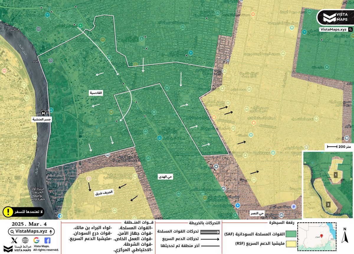 – القوات المسلحة تفرض سيطرتها على منطقة القادسية ومحيط جسر المنشية من جهة شرق النيل، وبذلك باتت تسيطر على جميع مخارج المحلية وتفرض حصارًا على مليشيا الدعم السريع التي لا تزال متحصنة في بعض أحياء الحاج يوسف (1)، ومناطق أم دوم والجريف شرق (2).
