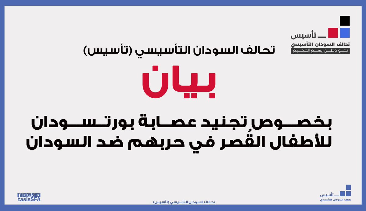 تحالف السودان التأسيسي (تأسيس) يدعو جميع الفاعلين السياسيين ومنظمات المجتمع المدني المهتمة بحقوق الطفل والمجتمع الإقليمي والدولي لإدانة ذلك وتسلط الضوء على جرائم هؤلاء الجهاديين الإرهابيين في حق السودان وشعوبه وأطفاله ومستقبله وعدم تورعهم عن فعل أي شيء في سبيل عودتهم للسلطة ولو على أشلاء ودماء السودانيين والسودانيات.