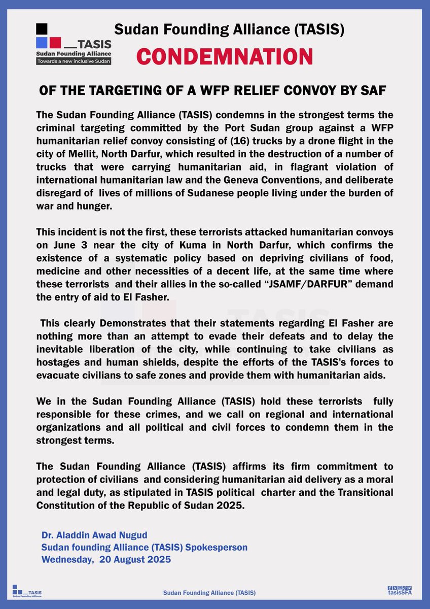 تحالف السودان التأسيسي تأسيس Condemnation of the Targeting of a WFP Relief Convoy by SAF … By null Published August 30, 2025 Share SHARE Facebook Twitter Pinterest LinkedIn[ad_1] Condemnation of the Targeting of a WFP Relief Convoy by SAF [ad_2] Source by تحالف السودان التأسيسي – (تأسيس) Facebook Twitter Pinterest LinkedIn Share This Article Facebook Twitter Email Print Previous Article ويسيرون فيه ببسالة وجسارة أدهشت العالم بهدف واضح تعبر عنه المواثيق التي ولدت من … Next Article ••• بسم الله الرحمن الرحيم *كلمة الأمين العام لحزب الامة القومي الحبيب الواثق… Leave a Comment Leave a Reply Cancel replyYour email address will not be published. Required fields are marked *Comment * Name * Email * Website Save my name, email, and website in this browser for the next time I comment. Δ SearchSearchRecent Postsأكرمنا الله صباح اليوم الأحد بلقاء إخوةٍ كرام، على ضفة النيل الأزرق، حيث شاي الش… أعلن بنك السودان المركزي في منشور إدارة السياسات رقم (2025/15) رفع الاحتكار عن ا… ندوة بعنوان: القانون الدولي والسيادة الوطنية قراءة في موقف السودان من لجنة تقصي … والي نهر النيل تستقبل وزير الموارد البشرية والرعاية الاجتماعية الوزير يشيد بالأ… كامل ادريس: رئيس اللجنة السياسية لمؤسسات الدولة السودانية. Recent CommentsNo comments to show.