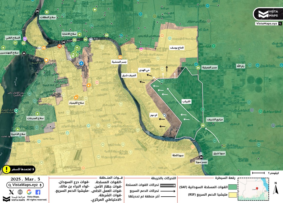 – القوات المسلحة السودانية تفرض سيطرتها على الكرياب وأجزاء من حي النصر وتتقدم جنوب حي الهدى، بينما تستمر في تضييق الخناق على مليشيا الدعم السريع مما دفعها للانسحاب نحو أم دوم وشمال حي الهدى والجريف شرق.
