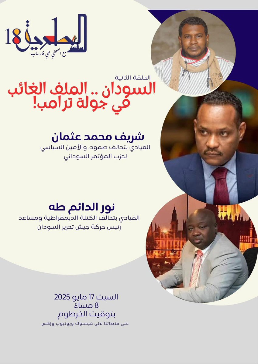 برنامج “الطريق 18” الذي يديره ويقدمه الصحفي أ.علي فارساب يستضيف أ.شريف محمد عثمان @sharefsharef الأمين السياسي للحزب في معية أ.نور الدائم طه – مساعد رئيس حركة تحرير السودان/مناوي للحديث تحت عنوان (#السودان .. الملف الغائب في جولة #ترامب!) وذلك مساء اليوم السبت الموافق 17 مايو 2025م على الساعة الثامنة مساءً بتوقيت السودان.