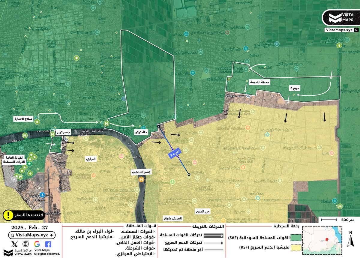 – القوات المسلحة تفرض سيطرتها على سوق حلة كوكو وتقلّص المسافة إلى جسر المنشية لـ2.4 كيلومتر، والذي بعد السيطرة عليه سيتيح لها التحكم في جميع مخارج محلية شرق النيل وفرض حصار على مليشيا الدعم السريع في المنطقة.
