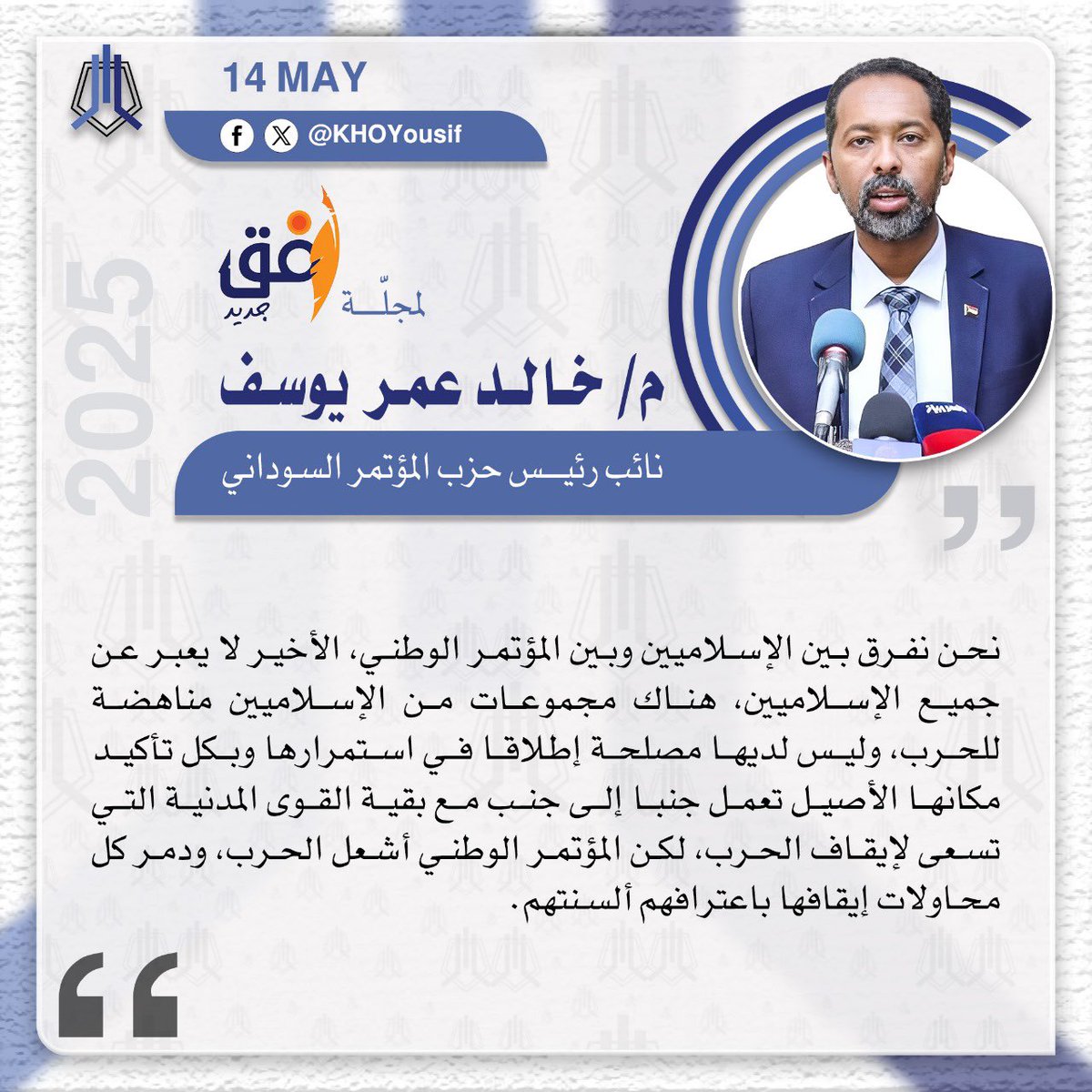 ⭕ خالد عمر يوسف @KHOYousif لمجلة “أفق جديد “: نحن نفرق بين الإسلاميين وبين المؤتمر الوطني، الأخير لا يعبر عن جميع الإسلاميين، هناك مجموعات من الإسلاميين مناهضة للحرب، وليس لديها مصلحة إطلاقاً في استمرارها وبكل تأكيد مكانها الأصيل أن تعمل جنباً إلى جنب مع بقية القوى المدنية التي تسعى لإيقاف الحرب، لكن المؤتمر الوطني أشعل الحرب، ودمر كل محاولات إيقافها باعترافهم و ألسنتهم.