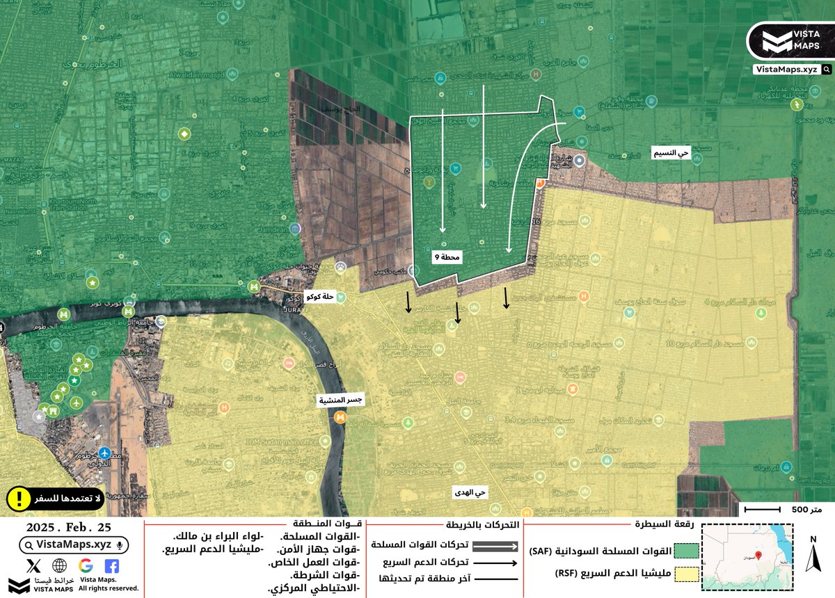 – مليشيا الدعم السريع تنسحب جنوبًا، بينما تتقدم القوات المسلحة نحو جسر المنشية في خطوة تهدف إلى فرض حصار كامل على عناصر المليشيا المتبقية بشرق النيل، تأتي هذه الخطوة بعد نجاحها في السيطرة على الناحية الشرقية لجسر سوبا في جنوب المحلية.