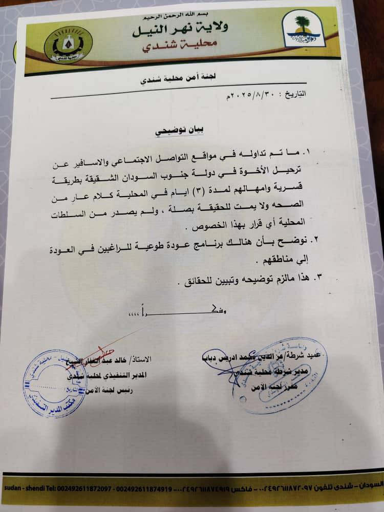 بورتسودان 30-8-2025 (سونا) – قال المدير التنفيذي لمحلية شندي بولاية نهر النيل، خالد عبد القادر الشيخ، أن ما تم تداوله بمواقع التواصل الإجتماعي عن ترحيل الجنوبيين من شندي غير صحيح.