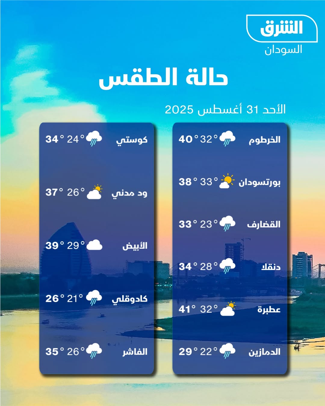 قناة الشرق حالة #الطقس في #السودان اليوم #الشرق_السودان By null Published August 31, 2025 Share SHARE Facebook Twitter Pinterest LinkedIn[ad_1] حالة #الطقس في #السودان اليوم #الشرق_السودان [ad_2] Source Facebook Twitter Pinterest LinkedIn Share This Article Facebook Twitter Email Print Previous Article مليشيا الدعم السريع تستهدف محول كهرباء في مدينة أمدرمان، عبر طائرة مُسيّرة مما … Next Article آلاف المتظاهرين في مدينة فرانكفورت الألمانية يخرجون للمطالبة بوقف الإبادة الجماع… Leave a Comment Leave a Reply Cancel replyYour email address will not be published. Required fields are marked *Comment * Name * Email * Website Save my name, email, and website in this browser for the next time I comment. Δ SearchSearchRecent Postsأكرمنا الله صباح اليوم الأحد بلقاء إخوةٍ كرام، على ضفة النيل الأزرق، حيث شاي الش… أعلن بنك السودان المركزي في منشور إدارة السياسات رقم (2025/15) رفع الاحتكار عن ا… ندوة بعنوان: القانون الدولي والسيادة الوطنية قراءة في موقف السودان من لجنة تقصي … والي نهر النيل تستقبل وزير الموارد البشرية والرعاية الاجتماعية الوزير يشيد بالأ… كامل ادريس: رئيس اللجنة السياسية لمؤسسات الدولة السودانية. Recent CommentsNo comments to show.