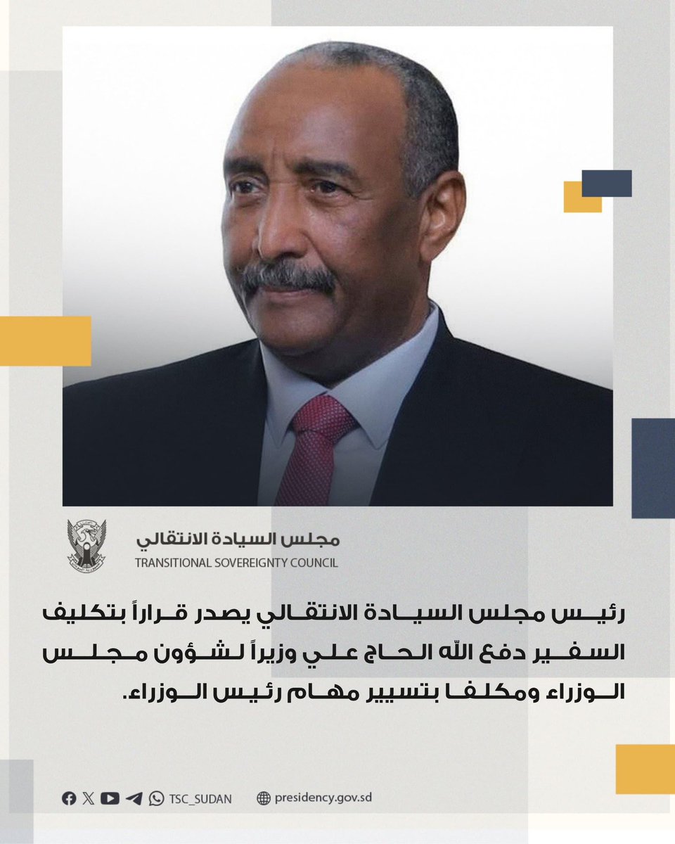 مجلس السيادة رئيس مجلس السيادة الانتقالي يصدر قراراً بتكليف السفير دفع الله الحاج علي وزيراً… By null Published August 31, 2025 Share SHARE Facebook Twitter Pinterest LinkedIn[ad_1] ⭕️ رئيس مجلس السيادة الانتقالي يصدر قراراً بتكليف السفير دفع الله الحاج علي وزيراً لشؤون مجلس الوزراء ومكلفاً بتسيير مهام رئيس الوزراء. بورتسودان ٣٠-٤-٢٠٢٥م [ad_2] Source by مجلس السيادة الإنتقالي – السودان Facebook Twitter Pinterest LinkedIn Share This Article Facebook Twitter Email Print Previous Article وزير التعليم العالي وأمين عام صندوق رعاية الطلاب يعزون أسرة الشهيد أمين حسن هارو… Next Article انهارت المليشيا في المقرن، وتلاشت أحلام حمدان في بسط حكمه على النهر. في هذه الل… Leave a Comment Leave a Reply Cancel replyYour email address will not be published. Required fields are marked *Comment * Name * Email * Website Save my name, email, and website in this browser for the next time I comment. Δ SearchSearchRecent Postsأكرمنا الله صباح اليوم الأحد بلقاء إخوةٍ كرام، على ضفة النيل الأزرق، حيث شاي الش… أعلن بنك السودان المركزي في منشور إدارة السياسات رقم (2025/15) رفع الاحتكار عن ا… ندوة بعنوان: القانون الدولي والسيادة الوطنية قراءة في موقف السودان من لجنة تقصي … والي نهر النيل تستقبل وزير الموارد البشرية والرعاية الاجتماعية الوزير يشيد بالأ… كامل ادريس: رئيس اللجنة السياسية لمؤسسات الدولة السودانية. Recent CommentsNo comments to show.
