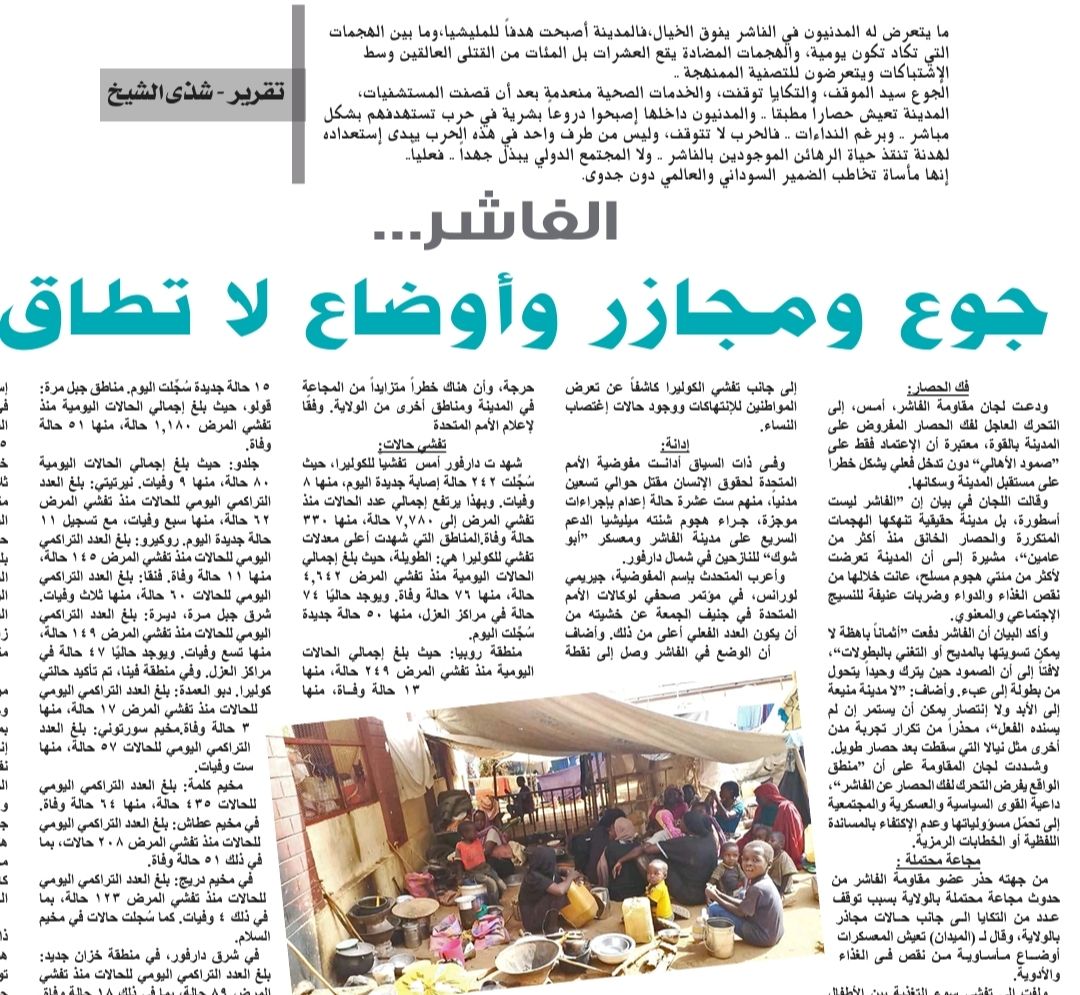 الجوع سيد الموقف، والتكايا توقفت، والخدمات الصحية منعدمة بعد أن قصفت المستشفيات، المدينة تعيش حصاراً مطبقاً .. والمدنيون داخلها إصبحوا دروعاً بشرية في حرب تستهدفهم بشكل مباشر .. وبرغم النداءات .. فالحرب لا تتوقف، وليس من طرف واحد في هذه الحرب يبدى إستعداده لهدنة تنقذ حياة الرهائن الموجودين بالفاشر .. ولا المجتمع الدولي يبذل جهداً .. فعلياً..