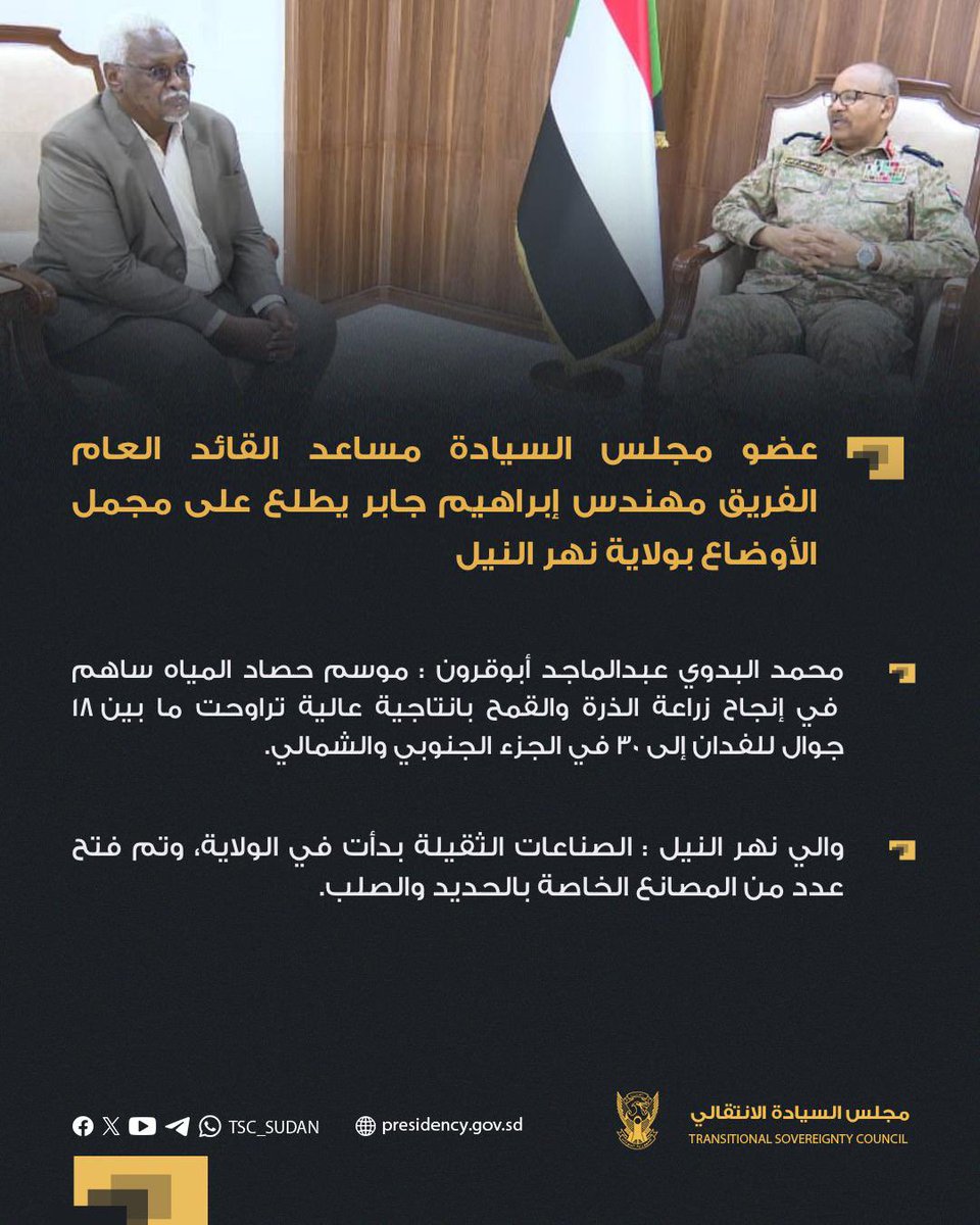 مجلس السيادة عضو مجلس السيادة مساعد القائد العام الفريق مهندس إبراهيم جابر يطلع على مجمل الأ… By null Published August 31, 2025 Share SHARE Facebook Twitter Pinterest LinkedIn[ad_1] ⭕️ عضو مجلس السيادة مساعد القائد العام الفريق مهندس إبراهيم جابر يطلع على مجمل الأوضاع بولاية نهر النيل بورتسودان ٢٩-٤-٢٠٢٥م [ad_2] Source by مجلس السيادة الإنتقالي – السودان Facebook Twitter Pinterest LinkedIn Share This Article Facebook Twitter Email Print Previous Article In continuation of my visit program to the Blue Nile region, I recorded a visit … Next Article الولد الأسمه الفاضل ده بيسئ لمصر حكومة و شعب ، طبيعي أن تقوم الدولة المصرية بإعت… Leave a Comment Leave a Reply Cancel replyYour email address will not be published. Required fields are marked *Comment * Name * Email * Website Save my name, email, and website in this browser for the next time I comment. Δ SearchSearchRecent Postsأكرمنا الله صباح اليوم الأحد بلقاء إخوةٍ كرام، على ضفة النيل الأزرق، حيث شاي الش… أعلن بنك السودان المركزي في منشور إدارة السياسات رقم (2025/15) رفع الاحتكار عن ا… ندوة بعنوان: القانون الدولي والسيادة الوطنية قراءة في موقف السودان من لجنة تقصي … والي نهر النيل تستقبل وزير الموارد البشرية والرعاية الاجتماعية الوزير يشيد بالأ… كامل ادريس: رئيس اللجنة السياسية لمؤسسات الدولة السودانية. Recent CommentsNo comments to show.