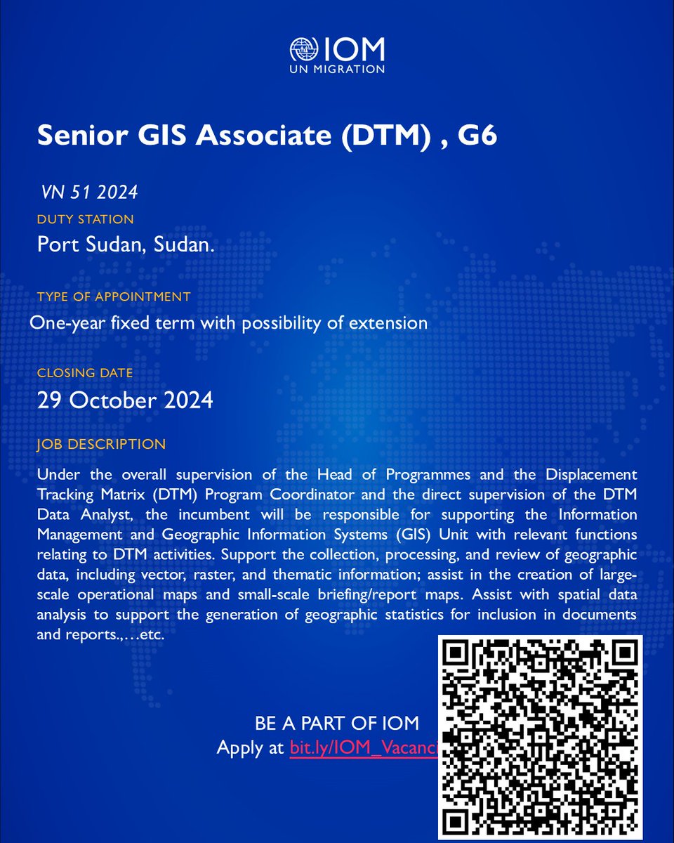 IOM is looking for a Senior GIS Associate (DTM), G6, in Port Sudan, Sudan.