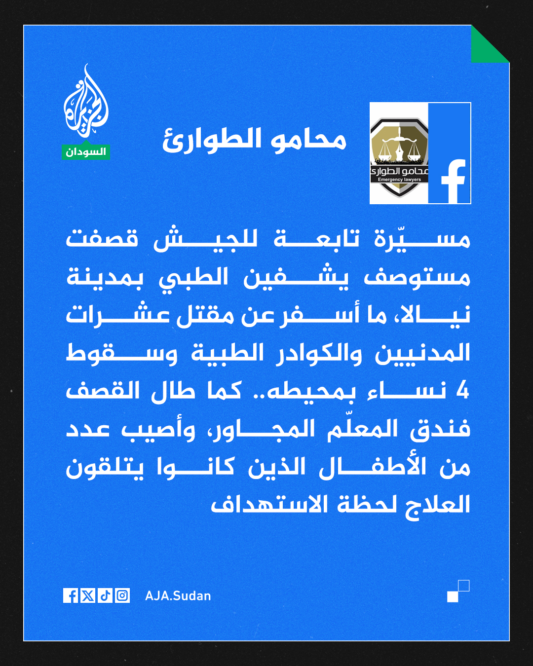 مجموعة محامي الطوارئ تتهم الجيش السوداني بقصف مركز طبي في #نيالا بجنوب دارفور بط…