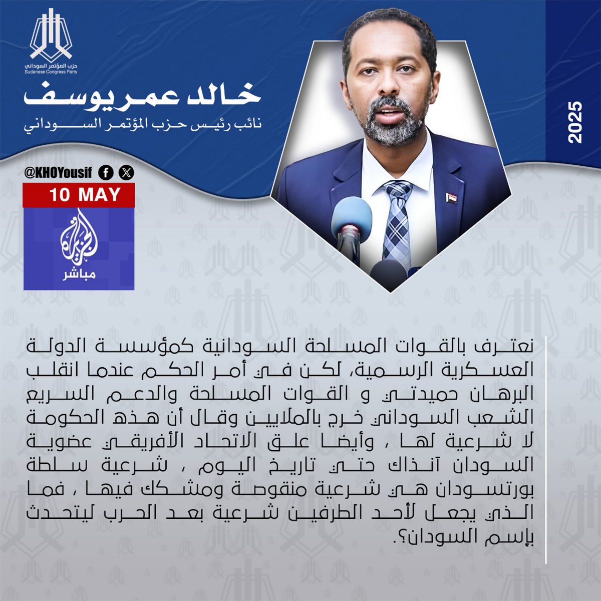 نعترف بالقوات المسلحة السودانية كمؤسسة الدولة العسكرية الرسمية، لكن في أمر الحكم عندنا انقلب البرهان حميدتي و القوات المسلحة والدعم السريع الشعب السوداني خرج بالملايين وقال أن هذه الحكومة لا شرعية لها ، وأيضا علق الاتحاد الأفريقي عضوية السودان آنذاك حتي تاريخ اليوم ، شرعية سلطة بورتسودان هي شرعية منقوصة ومشكك فيها ، فما الذي يجعل لأحد الطرفين شرعية بعد الحرب ليتحدث بإسم السودان؟.