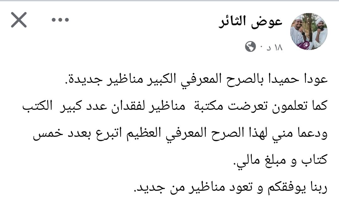 معمر موسى الحبيب عوض الثائر يتبرع بعدد 5 كتب ومبلغ مالي لصالح مشروع إعادة تأهيل مركز مناظي… By null Published September 1, 2025 Share SHARE Facebook Twitter Pinterest LinkedIn[ad_1] الحبيب عوض الثائر يتبرع بعدد 5 كتب ومبلغ مالي لصالح مشروع إعادة تأهيل مركز مناظير جديدة. [ad_2] Source Facebook Twitter Pinterest LinkedIn Share This Article Facebook Twitter Email Print Previous Article النائب العام المعينة كانت متعاونة مع القحاته Next Article \u062e\u0637\u0627\u0628 \u0642\u0648\u064a \u0648\u062a\u0627\u0631\u064a\u062e… Leave a Comment Leave a Reply Cancel replyYour email address will not be published. Required fields are marked *Comment * Name * Email * Website Save my name, email, and website in this browser for the next time I comment. Δ SearchSearchRecent Postsأكرمنا الله صباح اليوم الأحد بلقاء إخوةٍ كرام، على ضفة النيل الأزرق، حيث شاي الش… أعلن بنك السودان المركزي في منشور إدارة السياسات رقم (2025/15) رفع الاحتكار عن ا… ندوة بعنوان: القانون الدولي والسيادة الوطنية قراءة في موقف السودان من لجنة تقصي … والي نهر النيل تستقبل وزير الموارد البشرية والرعاية الاجتماعية الوزير يشيد بالأ… كامل ادريس: رئيس اللجنة السياسية لمؤسسات الدولة السودانية. Recent CommentsNo comments to show.