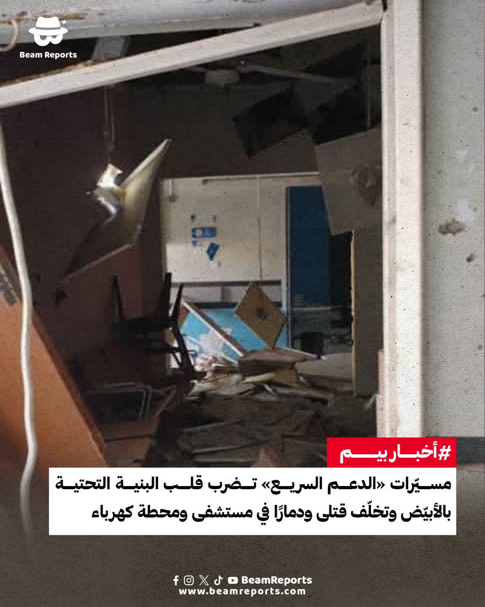 قال مصدر محلي من الأبيّض لـ«بيم ريبورتس» إن طائرة مسيّرة ضربت محطة الكهرباء الحرارية بالمدينة بعد منتصف الليل، وقصفت مستشفى «الضمان» في ساعات الفجر. فيما أفاد مصدر ثانٍ أن ضربة المسيّرة أعقبها قصف مدفعي من اتجاه مدينة «بارا» التي تسيطر عليها «الدعم السريع».