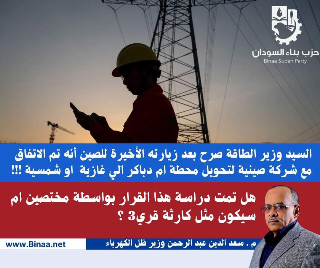وزير ظل الكهرباء: نسأل سيادة الوزير والسيد رئيس مجلس السيادة هل تمت دراسة هذا القرار بواسطة مختصين ام سيكون مثل كارثة قري3 ؟ ام سيترك الأمر للشركة الصينية تفعل ما تراه مناسبا لنا كما في امر الشركة الرومانية لمحطات بورتسودان القديمة ؟