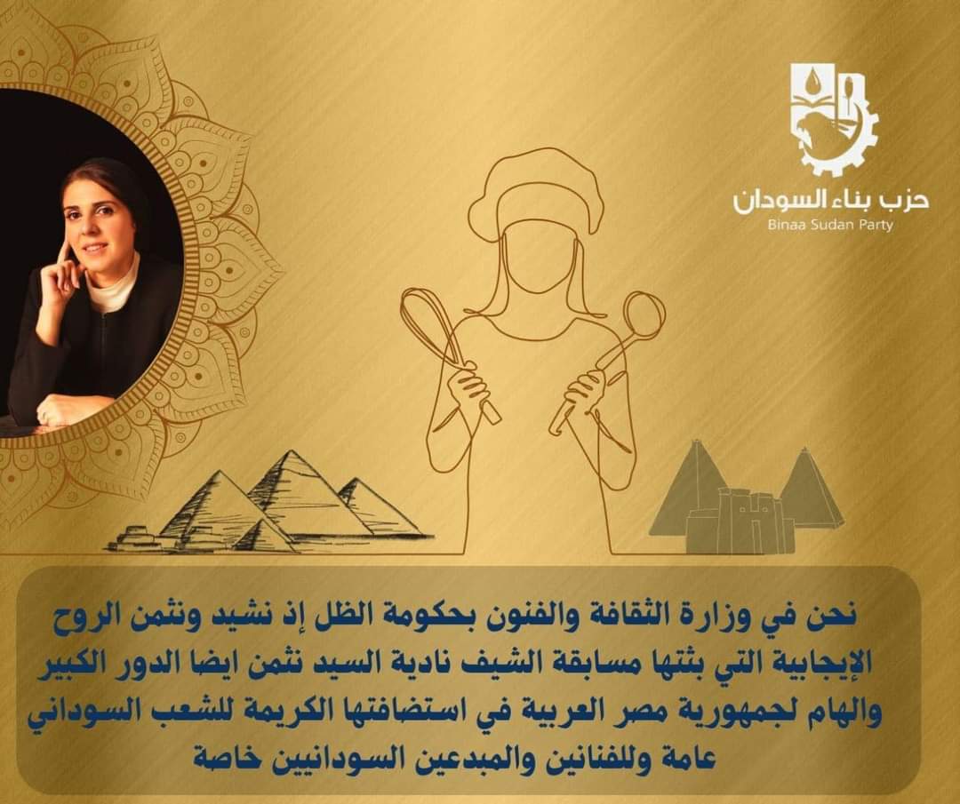تشيد وزارة الثقافة والفنون بحزب بناء السودان بمبادرة الشيف نادية السيد التي جذبت الشعبين السوداني والمصري بمحبة وتآخي ، لطالما كان فن الطبخ احد الفنون الأساسية التي تجمع بين الشعوب وتقربها ، إذ أن فن الطبخ حسب اليونسكو يصنف كأحد الأعمدة الأساسية للثقافة