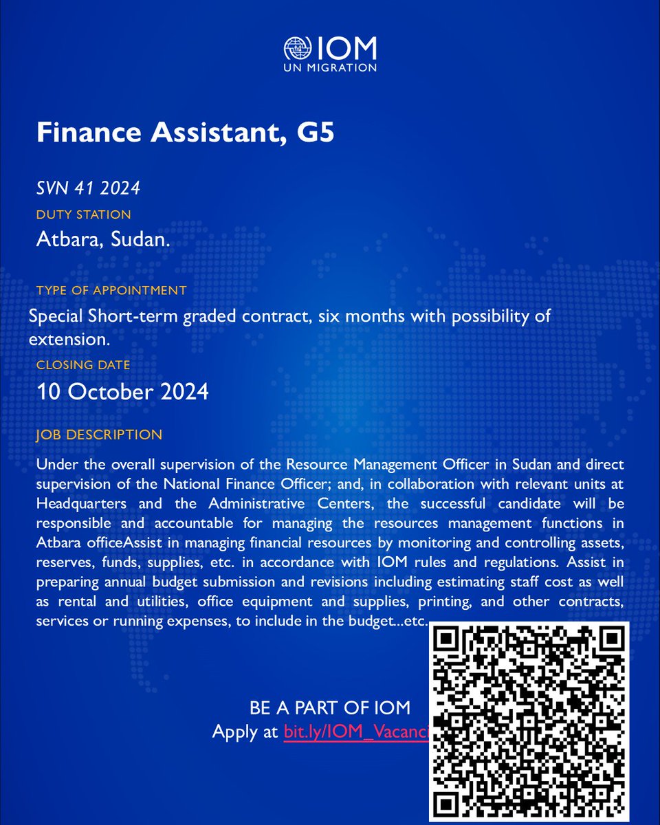 IOM is looking for a Finance Assistant, G5, in Atbara, Sudan.