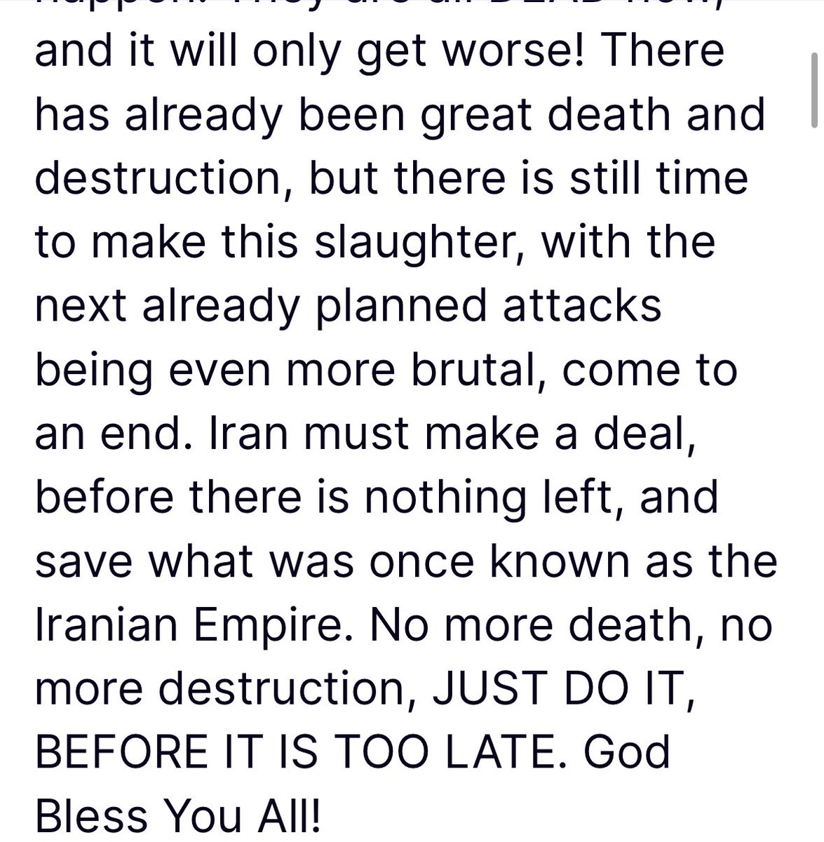 🚨#ترمب يتوجه بالحديث ل #إيران : “هناك الكثير من الموت والدمار، لكن لا يزال هناك وقت لوقف هذه المذبحة فالضربات المقبلة و المخطط لها مسبقا” ستكون اكثر حدة. على ايران التوصل إلى اتفاق قبل ألا يتبقى شيء، وإنقاذ ما كان يُعرف سابقًا بالإمبراطورية الفارسية. لا مزيد من الموت، لا مزيد من الدمار، افعلوها، قبل فوات الأوان.”