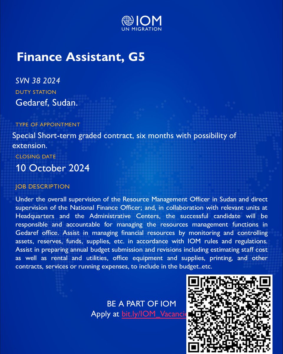 IOM is looking for a Finance Assistant , G5, in Gedaref, Sudan.