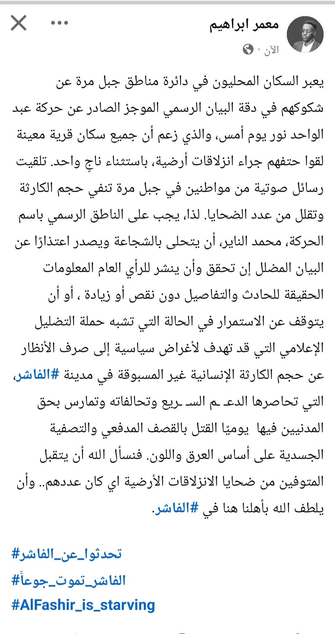 في المقابل، تعيش مدينة الفاشر أزمة إنسانية خانقة، وحصارا تفرضه عليها ميليشيا الجنـ.جويد أدى إلى تجويع الملايين وحرمانهم من أبسط مقومات الحياة، بينما يبدو أن عبد الواحد نور لا يعبأ بهذه الكارثة الإنسانية، منشغلاً بالتنقيب عن الذهب في المنطقة، وفتح المجال لإسـ.رائيل