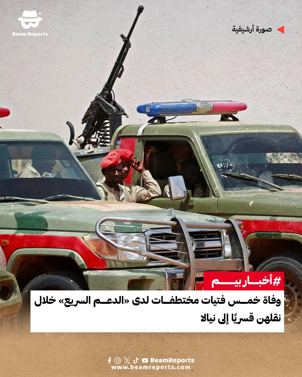 أعلن الناطق الرسمي باسم مخيم زمزم للنازحين، محمد خميس دودة، الثلاثاء، عن وفاة خمس فتيات أثناء عملية نقل قسري نفذتها قوات الدعم السريع، شملت 23 فتاة كانت قد اختطفتهن سابقًا من أحياء متفرقة بمدينة الفاشر إلى نيالا بجنوب دارفور.