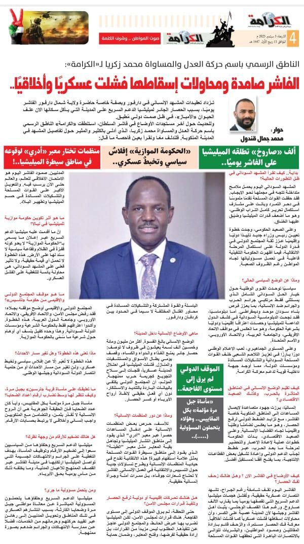 الناطق الرسمي باسم حركة العدل والمساواة محمد زكريا لـ”الكرامة”: