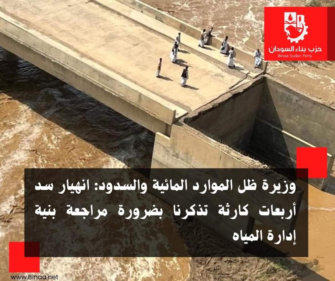 كما تؤكد وزارة الموارد المائية والسدود في حزب بناء السودان على أن عملية إعادة تأهيل هيكل السدود يجب أن تتماشى مع معايير عالية تأخذ في الاعتبار الفيضانات المستقبلية وأي حوادث متعلقة بمستويات المياه. ستظل الوزارة ملتزمة بالعمل مع جميع مستويات الحكومة والمجتمع المدني لمعالجة الاحتياجات العاجلة للمتضررين ومنع وقوع مثل هذه المآسي مرة أخرى.