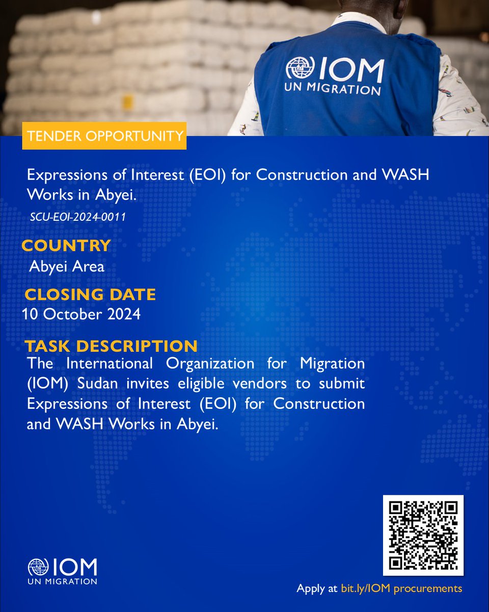 The International Organization for Migration (IOM) Sudan invites eligible vendors to submit EOI for Construction and WASH Works in Abyei.