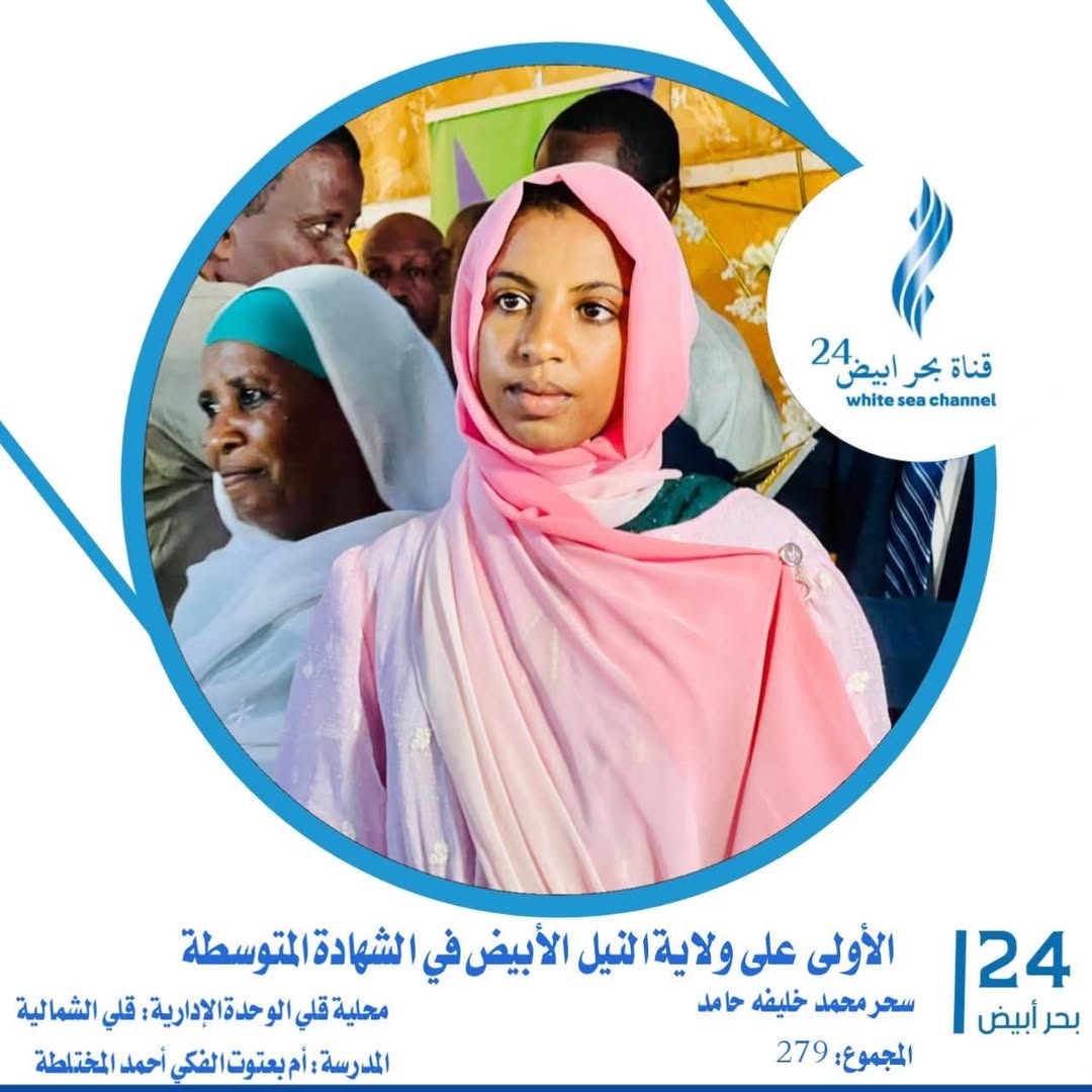 ■ نثرت الطالبة سحر محمد خليفة حامد الفرح بكل البيوت والمدارس بولاية النيل الأبيض. سحر تقدّمت أقرانها بإحراز 279 درجة أهّلتها للجلوس على كرسي المقعد الأول لامتحانات المرحلة المتوسطة بالولاية لهذا العام.