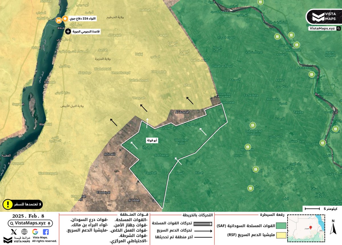 – القوات المسلحة تفرض سيطرتها على منطقة أبو قوتة وعدة قرى مجاورة، في حين تنسحب مليشيا الدعم السريع نحو غرب الجزيرة.