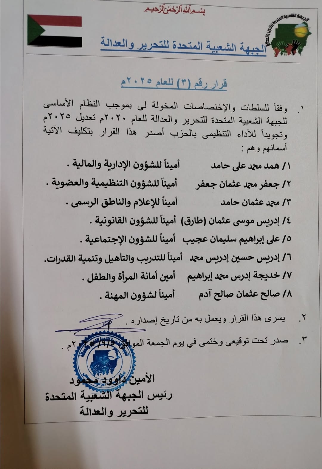 الاورطة الجبهة الشعبية المتحدة للتحرير والعدالة قرار تكليف المكتب التنفيذي للجبهة الشعب… By null Published September 5, 2025 Share SHARE Facebook Twitter Pinterest LinkedIn[ad_1] الجبهة الشعبية المتحدة للتحرير والعدالة قرار تكليف المكتب التنفيذي للجبهة الشعبية المتحدة للتحرير والعدالة [ad_2] Source Facebook Twitter Pinterest LinkedIn Share This Article Facebook Twitter Email Print Previous Article في ظل حالة اختطاف الدولة ، الطريقة الوحيدة لحماية الموارد الوطنية هي .. المجتمعا… Next Article الأستاذ قريب الله محمد الحسن (الأمين العام للتجمع الاتحادي) يدلي بشهادة قيمة للت… Leave a Comment Leave a Reply Cancel replyYour email address will not be published. Required fields are marked *Comment * Name * Email * Website Save my name, email, and website in this browser for the next time I comment. Δ SearchSearchRecent Postsأكرمنا الله صباح اليوم الأحد بلقاء إخوةٍ كرام، على ضفة النيل الأزرق، حيث شاي الش… أعلن بنك السودان المركزي في منشور إدارة السياسات رقم (2025/15) رفع الاحتكار عن ا… ندوة بعنوان: القانون الدولي والسيادة الوطنية قراءة في موقف السودان من لجنة تقصي … والي نهر النيل تستقبل وزير الموارد البشرية والرعاية الاجتماعية الوزير يشيد بالأ… كامل ادريس: رئيس اللجنة السياسية لمؤسسات الدولة السودانية. Recent CommentsNo comments to show.