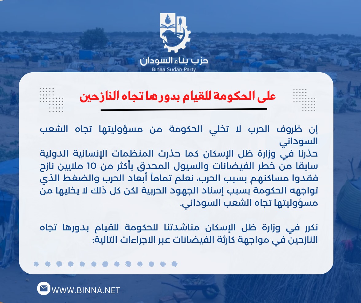 حذرنا في وزارة ظل الإسكان كما حذرت المنظمات الإنسانية الدولية سابقا من خطر الفيضانات والسيول المحدق بأكثر من 10 ملايين نازح فقدوا مساكنهم بسبب الحرب، نعلم تماماً أبعاد الحرب والضغط الذي تواجهه الحكومة بسبب إسناد الجهود الحربية لكن كل ذلك لا يخليها من مسؤوليتها تجاه الشعب السوداني.