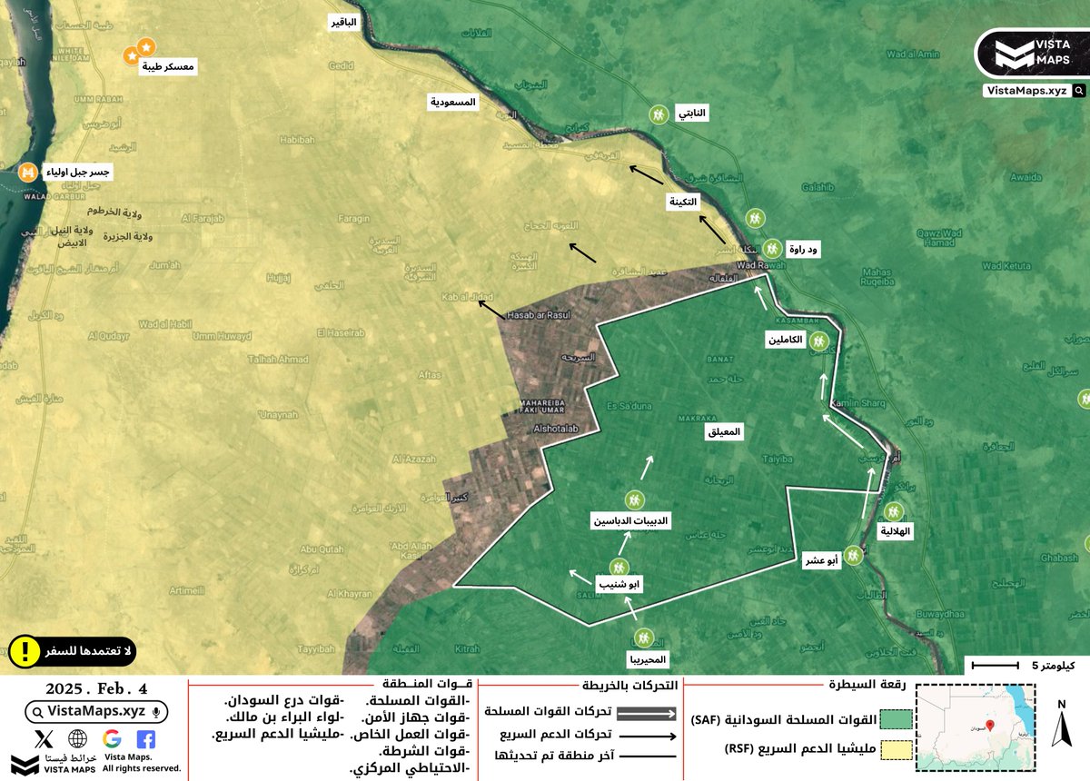 – لم يتبقَّ في مناطق سيطرة مليشيا الدعم السريع سوى 10% من الولاية وتقتصر على قرى متناثرة بين محليتي الكاملين والحصاحيصا، في حين تبسط القوات المسلحة سيطرتها على 90% من الولاية.