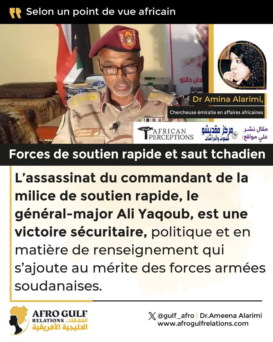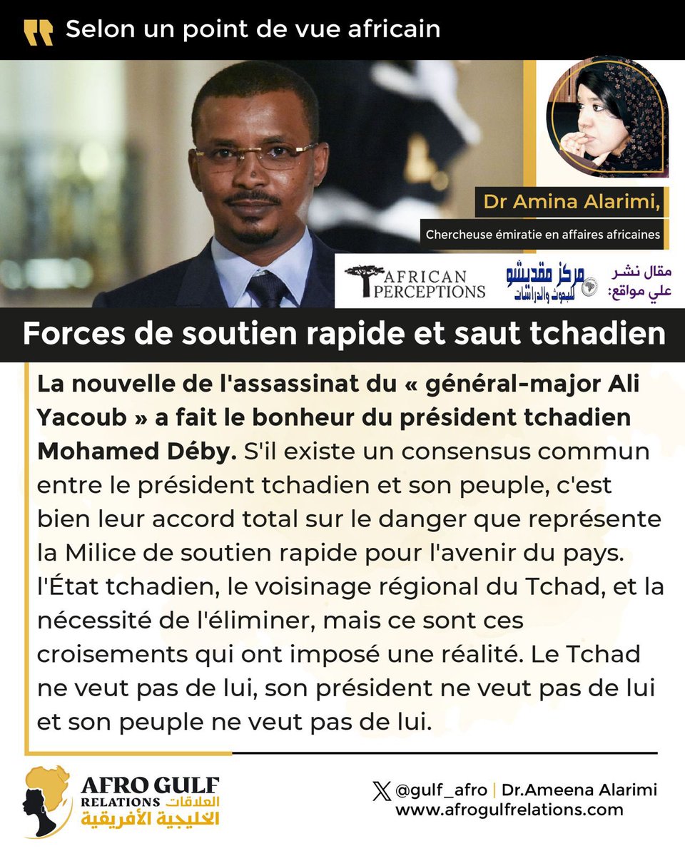 La nouvelle de l’assassinat du « général-major Ali Yacoub » a fait le bonheur du président tchadien Mohamed Déby. S’il existe un consensus commun entre le président tchadien et son peuple, c’est bien leur accord total sur le danger que représente la Milice de soutien rapide pour l’avenir du pays. l’État tchadien, le voisinage régional du Tchad, et la nécessité de l’éliminer, mais ce sont ces croisements qui ont imposé une réalité. Le Tchad ne veut pas de lui, son président ne veut pas de lui et son peuple ne veut pas de lui.