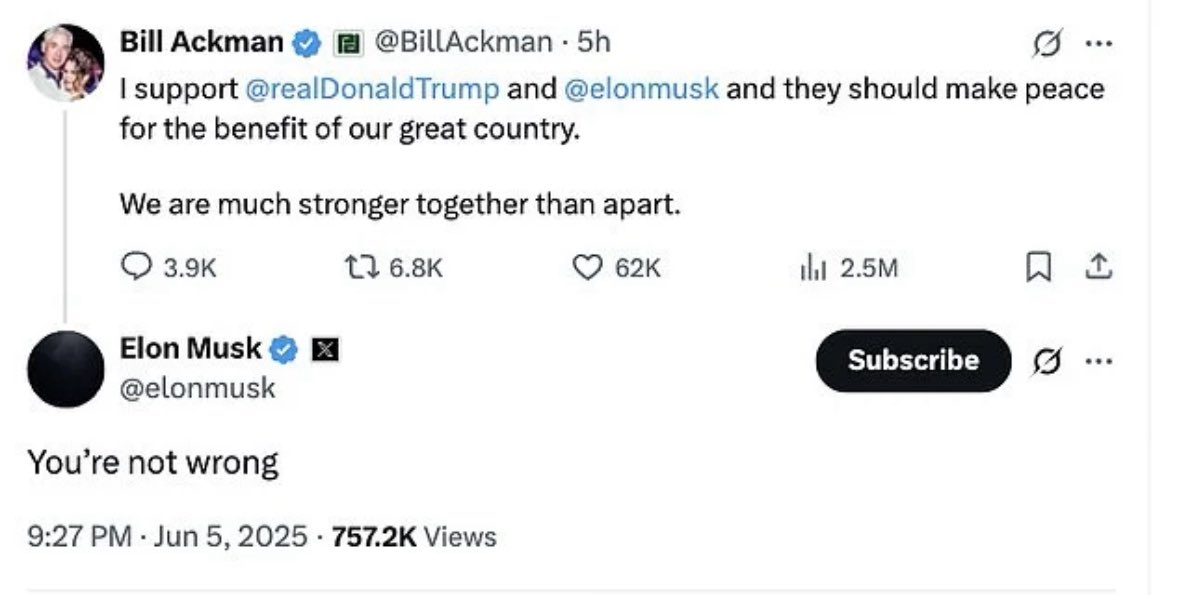 بعد نهار حافل بالتراشق الكلامي، ومساعي من البيت الأبيض لاحتواء التصعيد، يبدو ان ماسك مد غصن زيتون ل #ترامب – هنا رده على رجل الأعمال بيل أكمان الذي دعاهما للتصالح لمصلحة البلاد “نحن اكثر قوة سوية” ليرد #ماسك : “انت لست مخطئا”