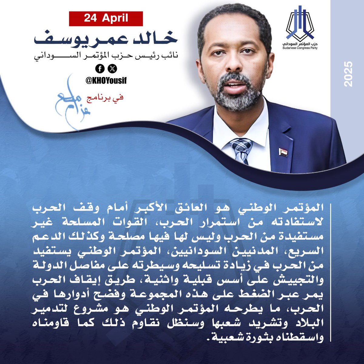 المؤتمر الوطني هو العائق الأكبر أمام وقف الحرب لاستفادته من استمرار الحرب، القوات المسلحة غير مستفيدة من الحرب وليس لها فيها مصلحة وكذلك الدعم السريع، المدنيين السودانيين، المؤتمر الوطني يستفيد من الحرب في زيادة تسليحه وسيطرته على مفاصل الدولة والتجييش على أسس قبلية واثنية، طريق إيقاف الحرب يمر عبر الضغط على هذه المجموعة وفضح أدوارها في الحرب، ما يطرحه المؤتمر الوطني هو مشروع لتدمير البلاد وتشريد شعبها وسنظل نقاوم ذلك كما قاومناه واسقطناه بثورة شعبية.