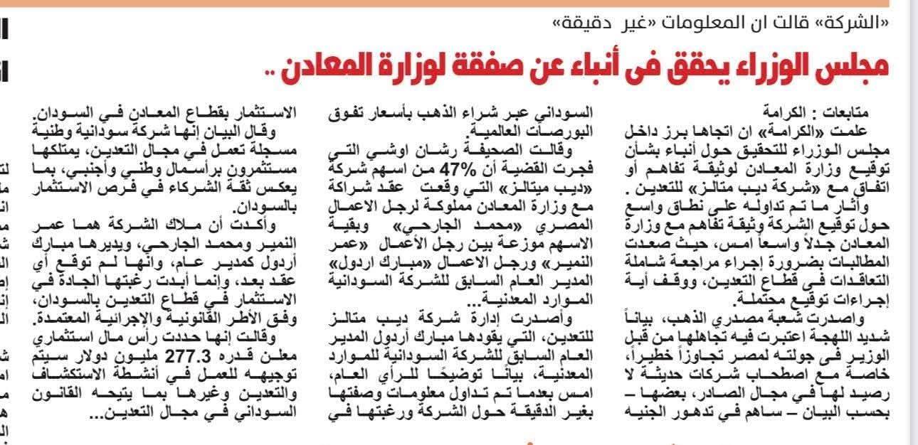 وكانت الصحفية السودانية رشان أوشي، فجرت قضية إعلان رجل الأعمال المصري محمد الجارحي توقيع صفقة تعدين ذهب ضخمة مع وزارة المعادن السودانية بقيمة 277 مليون دولار، تضمنت الاستحواذ على 85% من منجم أرياب وخطط لإنشاء مصنع لمعالجة المخلفات، والتي وصفت الصفقة بـ”المشبوهة” وحذرت من “تحالفات فساد” تتحكم في ثروات السودان، مطالبة بكشف تفاصيل العقود ونسب الشراكة. منشوراتها تحولت إلى ترند وأجبرت الوزارة على الخروج ببيان عاجل.