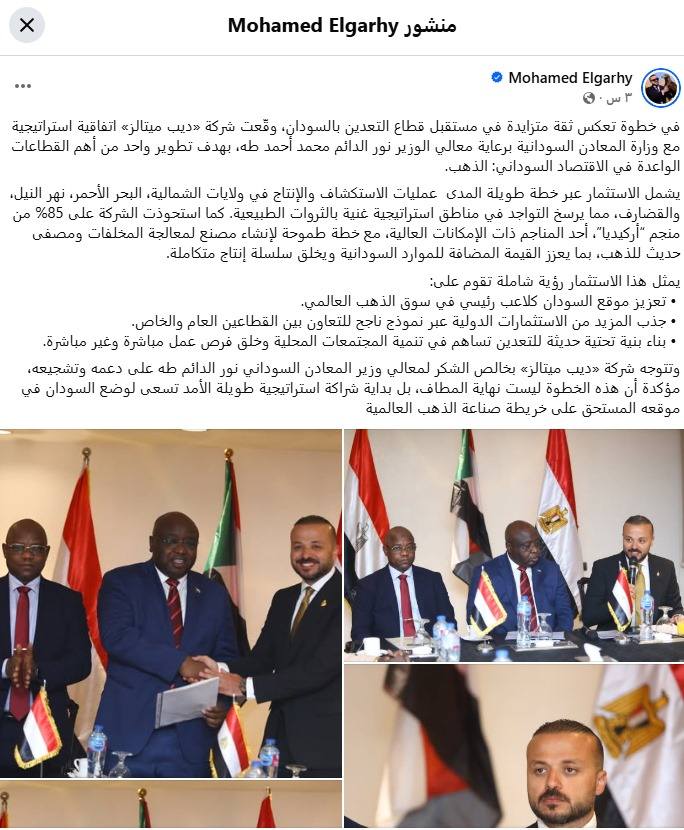 ◀في تطور مثير، اشتعلت أزمة بعد إعلان رجل الأعمال المصري محمد الجارحي توقيع صفقة تعدين ذهب ضخمة مع وزارة المعادن السودانية بقيمة 277 مليون دولار، تضمنت الاستحواذ على 85% من منجم أرياب وخطط لإنشاء مصنع لمعالجة المخلفات واستكشاف جديد في عدة ولايات.