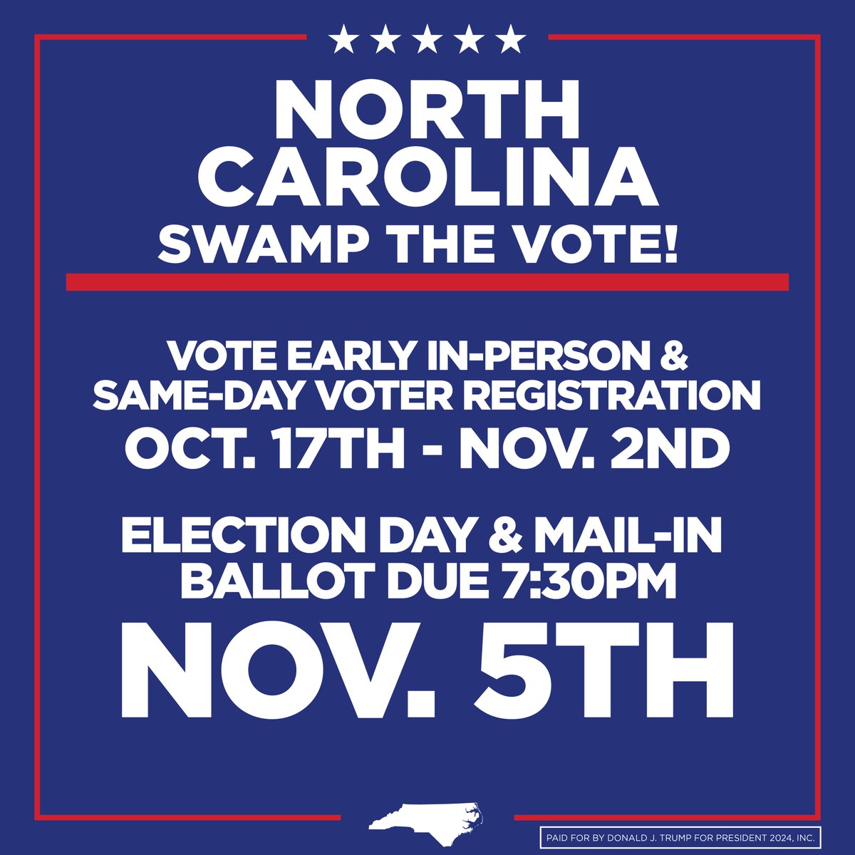 NORTH CAROLINA! Tomorrow is the last day to register to vote, and vote early in-person! #SwampTheVote https://t.co/oNXWVybWqe https://t.co/QLn1dPYTCS